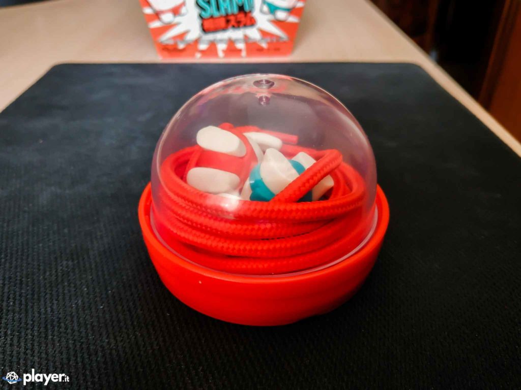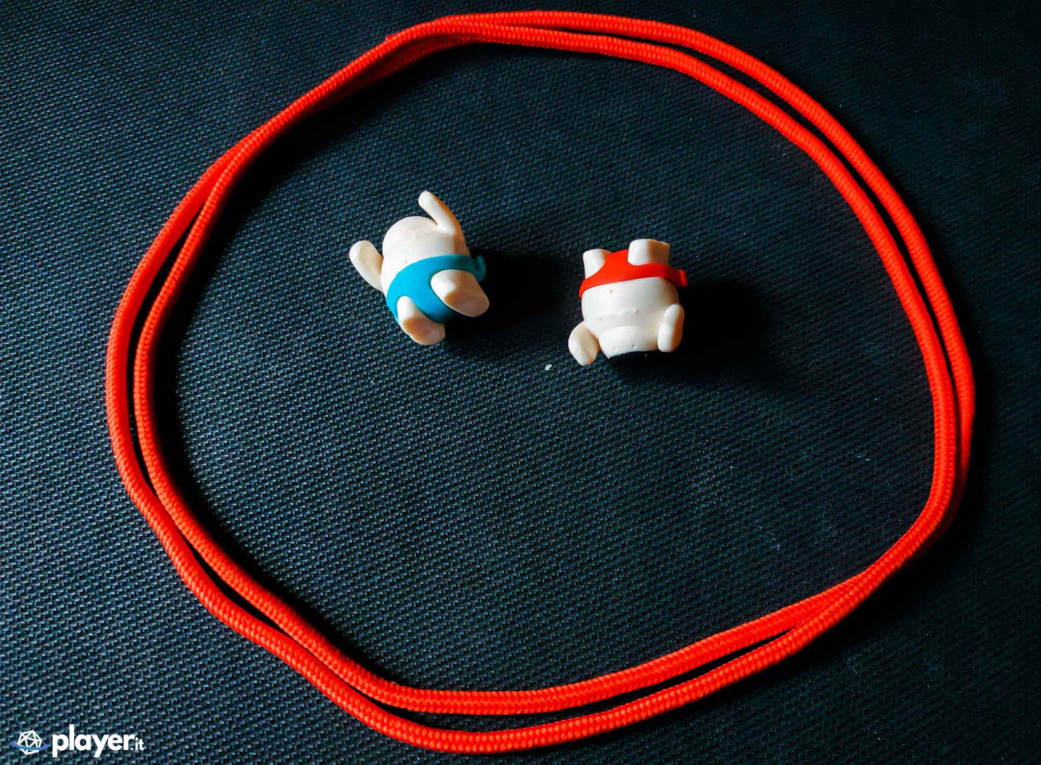 La confezione di Sumo Slam attira subito l’attenzione grazie alla sua forma che ricorda qualcosa a metà strada tra un ramen d’asporto e un ufo dal cui oblò si affacciano i due lottatori. Al suo interno sono sapientemente alloggiati i diversi componenti essenziali del gioco: 1 regolamento, 2 matite, 1 blocco per segnare i punti, 2 legende punti, 1 laccio che farà da Dohyo, 1 capsula, 2 lottatori.
