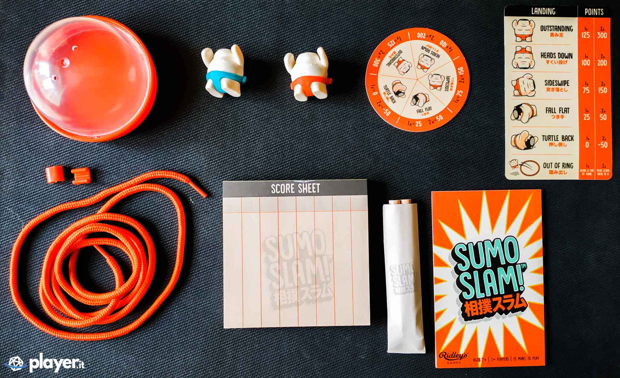Sumo Slam è un gioco di “dadi” da 2 persone in su nella quale lanceremo a turno due lottatori nel ring, o meglio Dohyo, per ottenere il maggior numero di punti. Ogni giocatore avrà a disposizione 3 tiri dove potrà decidere se accontentarsi del risultato ottenuto o rilanciare uno o entrambi i lottatori, a seconda della posizione in cui si fermeranno i due panciuti contendenti si otterranno dei punti che vanno dallo 0 se saranno schiena a terra o fuori dal Dohyo fino a 125 punti se in piedi, finito il turno si sommano le singole posizioni dei sumotori e si passa al giocatore successivo.