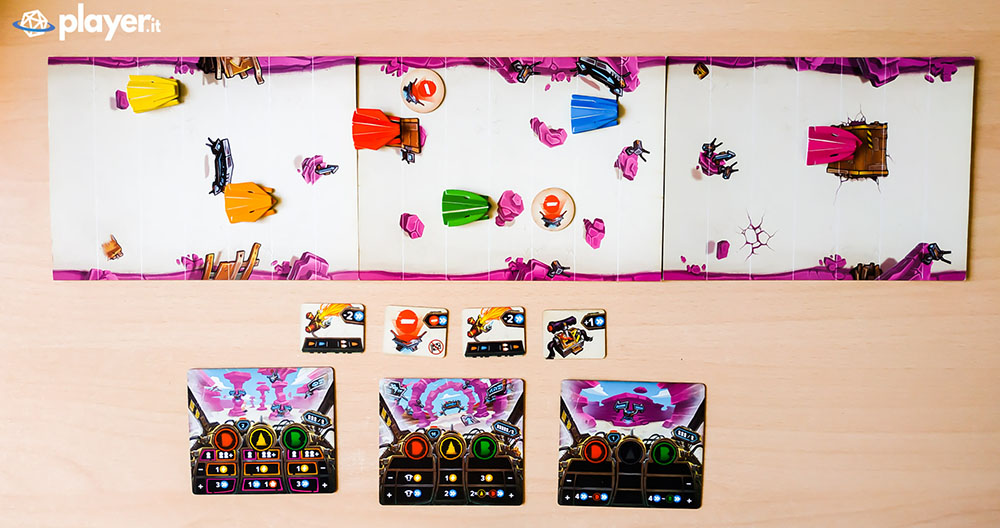 In Outspeed sfideremo i nostri amici in un’adrenalinica gara di navicelle spaziali piena di trappole, power up e imprevisti. A seconda della carta percorso che pescheremo dovremo programmare le nostre scelte sul joystick prevedendo le mosse degli avversari, qui potete tranquillamente parlare durante la fase di programmazione e di conseguenza bluffare. Una volta rivelate le proprie mosse si muoveranno le navicelle di tanti spazi sul tracciato quanti indicati dal percorso scelto. Come dicevamo prima la strada sarà disseminata di trappole e power up ed quindi probabile che non tutti arriveranno vivi al traguardo.