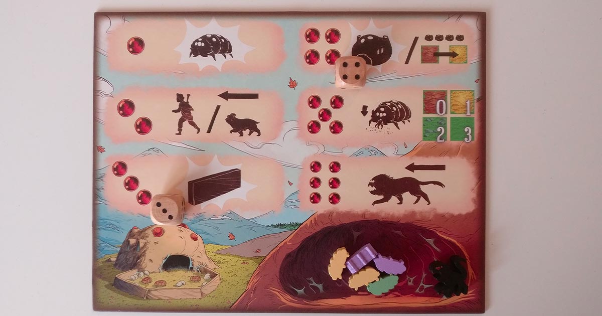 - L’Ookami può entrare in una tessera con un pastore e spingere, o con degli Imomushi e portarli nella sua tana (ovvero rimuoverli dalla tessera e posizionarli nell’apposita zona della plancia delle azioni), dove a fine partita faranno perdere punti ai proprietari.