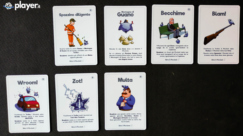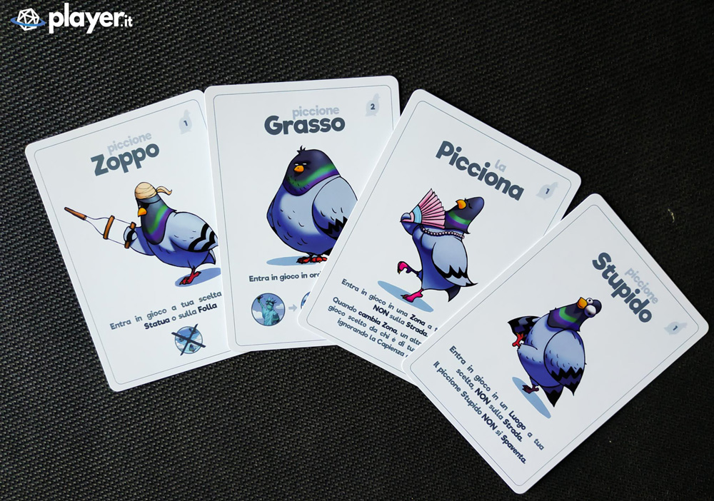 Ciò che rende davvero divertente questo gioco è l’interazione continua tra i giocatori che si battaglieranno per rubare punti o ostacolare gli avversari, difficilmente ci saranno momenti morti soprattutto quando si susseguono le carte con la dicitura reazione o quando si assegnano carte Guano agli avversari. Ogni Piccione poi ha una sua peculiarità che lo porterà ad interagire diversamente con i luoghi o i giocatori.
