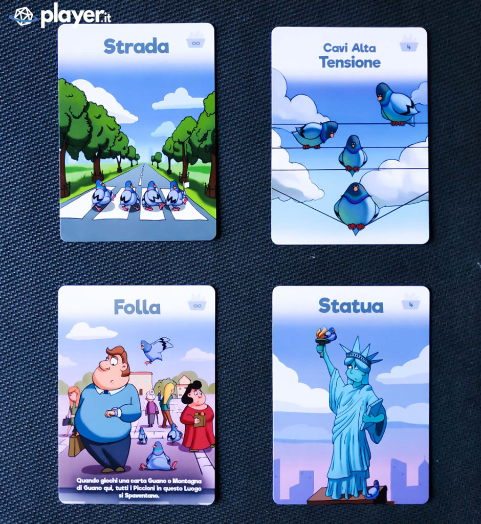 Il setup è molto semplice: si posizionano le quattro carte Luogo (Strada, Statua, Cavi Alta Tensione, Folla) al centro del tavolo queste saranno le destinazioni principali dei fastidiosi pennuti ma ciò non li esonerà dallo svolazzare verso le nostre aree che saranno un po’ come i cornicioni dei nostri balconi. Si dividono poi le carte Azione e le carte Piccione per formare due mazzi separati, quando il mazzo dei piccioni sarà terminato verrà dichiarata la fine della partita ma attenzione tutte le carte Guano e Montagna di Guano e Piccione nella propria area vi faranno perdere punti durante il conteggio.