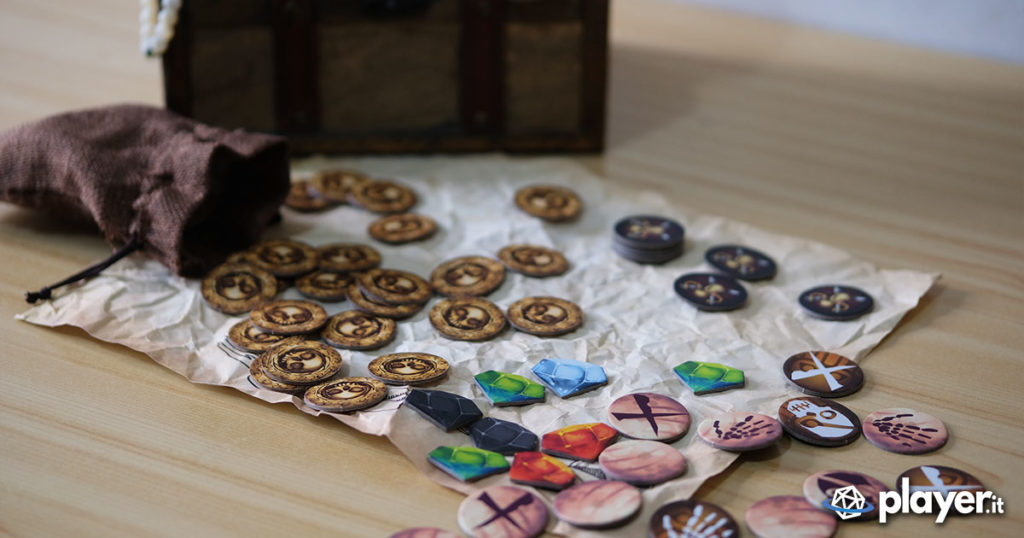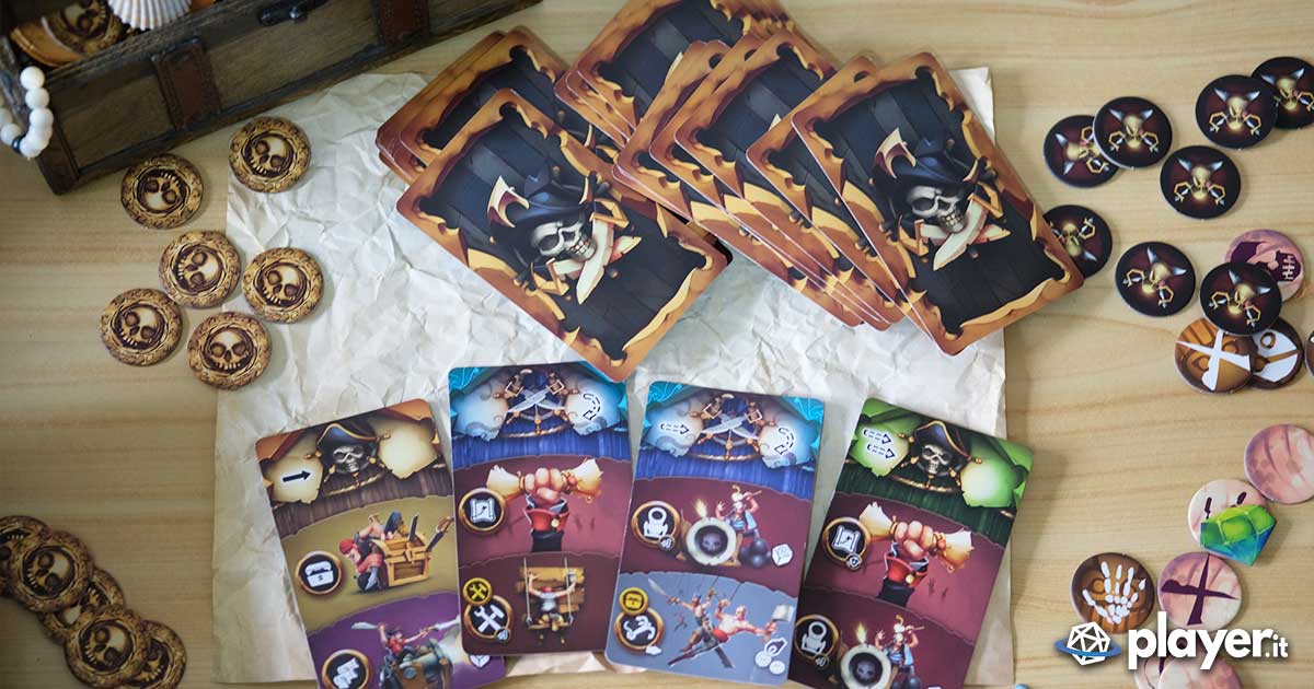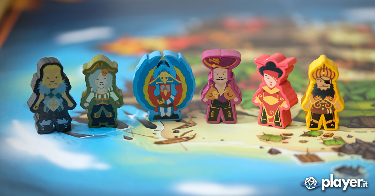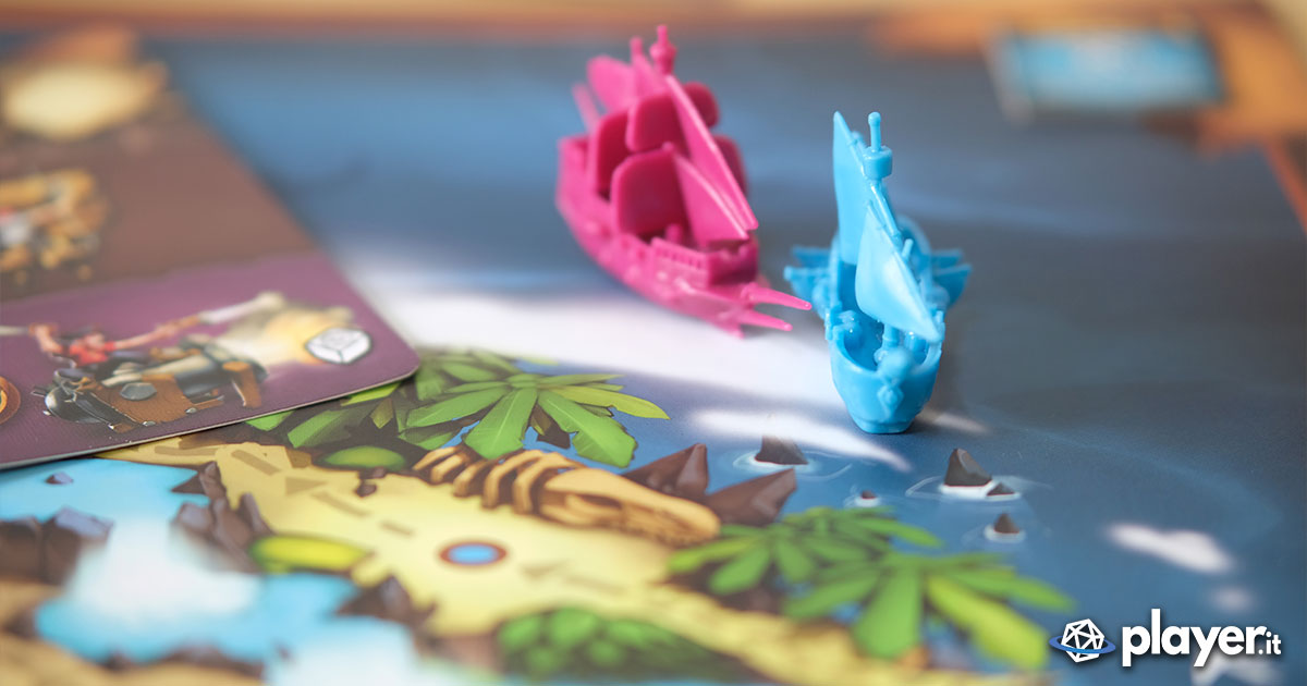 All’interno della cassa una mappa illustrata con un’isola centrale e un cerchio di mare a farle da cornice. Insieme a lei montagne di dobloni, diamanti, totem, segnalini Razzia, carte e altri materiali che simulano le ricompense e la vita piratesca dell’epoca. Presenti anche delle ricostruzioni, sottoforma di meeple, dei capitani pirata e delle miniature delle loro navi (anche in versione fantasma). Per simulare invece le battaglie combattute su quegli atolli tropicali è presente un dado attacco che permette di razziare i bottini o la ciurma degli avversari.