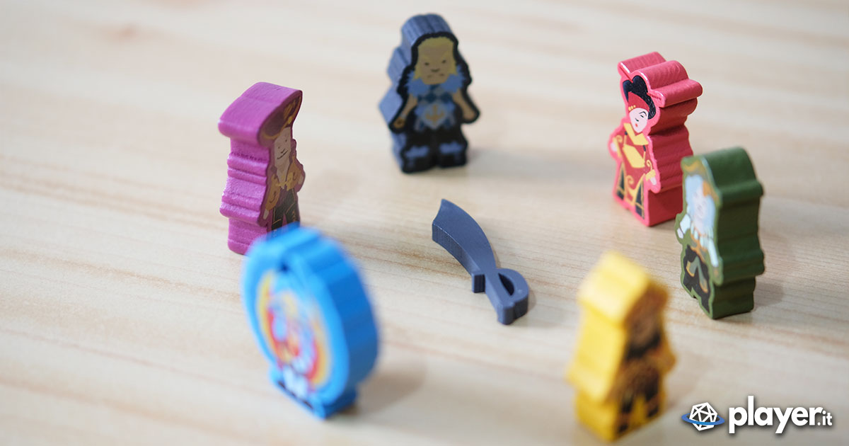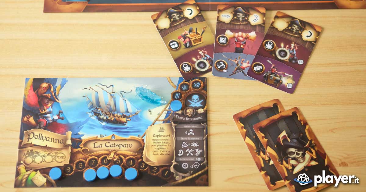 Infine, ogni capitano/nave ha una propria abilità: c’è chi può sparare più lontano, chi può avere una carta in più e anche chi non può essere depredato dei propri dobloni. Abilità interessanti, ma sbilanciate e che portano spesso a preferire alcuni personaggi piuttosto che altri, Pollyanna ad esempio può pescare due tessere luogo e scegliere quale delle due attivare, abilità che gli permette di sfuggire sempre ai luoghi meno convenienti. Fortunatamente, rubando o togliendo ciurma agli avversari non solo diminuirete il numero di carte iniziali che ottengono ogni turno, ma potrete anche togliergli le loro abilità.