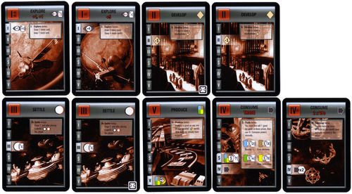- Produzione: i giocatori piazzano una Risorsa (una carta coperta dalla riserva) su ogni Pianeta di Produzione che ne è privo. La tipologia di Risorsa prodotta è indicata dal colore del Pianeta di Produzione. Il bonus è la possibilità di produrre una Risorsa su un Pianeta che fornisca Risorse Extra.