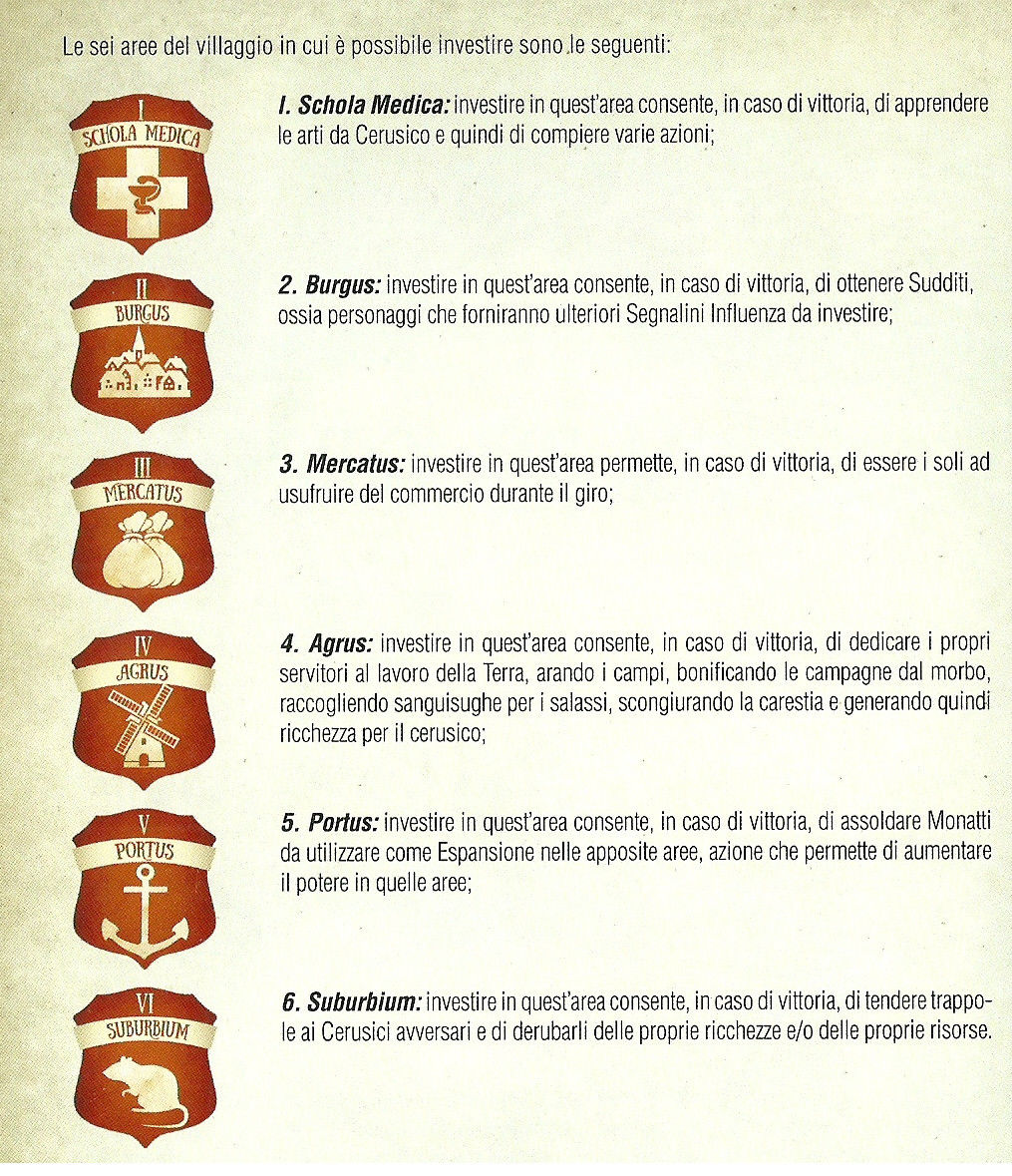 Agrus: iil giocatore che ha investito di più in quest’area può piazzare uno dei suoi segnalini Monatto sul campo coltivato raffigurato nel tabellone. In Fase Mantenimento ogni Monatto piazzato qui farà guadagnare 2 Danari al proprietario.