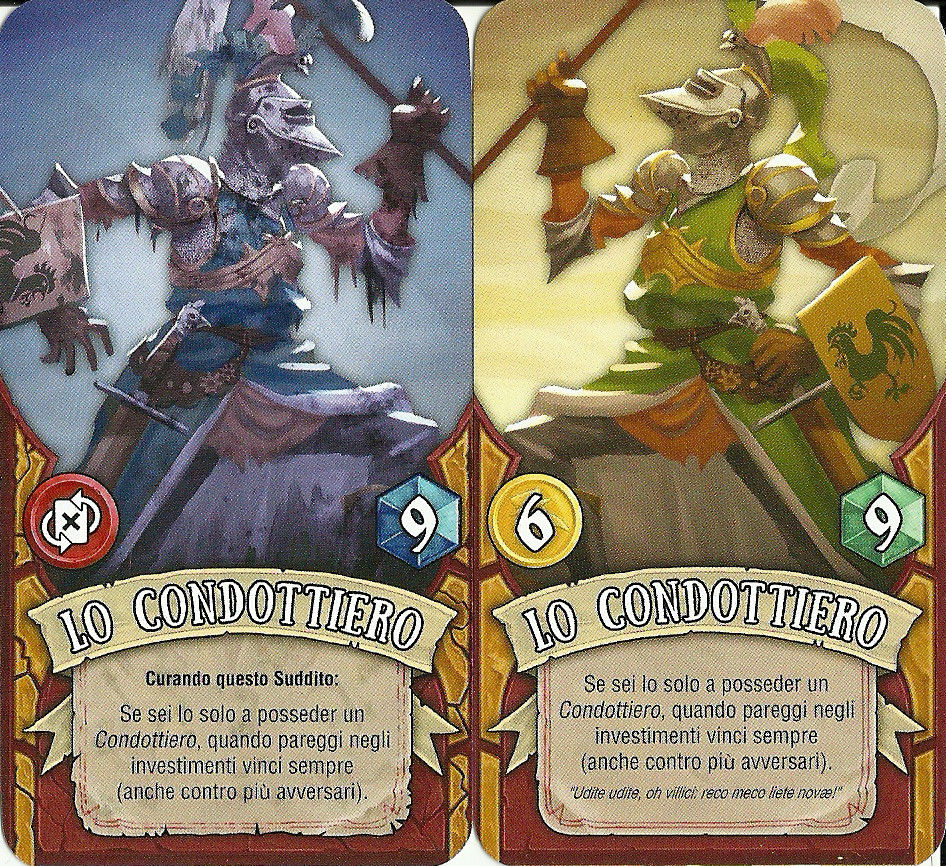 Ad esempio, “La Megera” consente di abbassare di 1 le puntate degli avversari in Fase di Influenza; “La Meretrice” consente di guadagnare più Danari quando si recuperano segnalini influenza inutilizzati; “Lo Banditore” consente di curare un altro Seguace gratuitamente una sola volta, e così via.