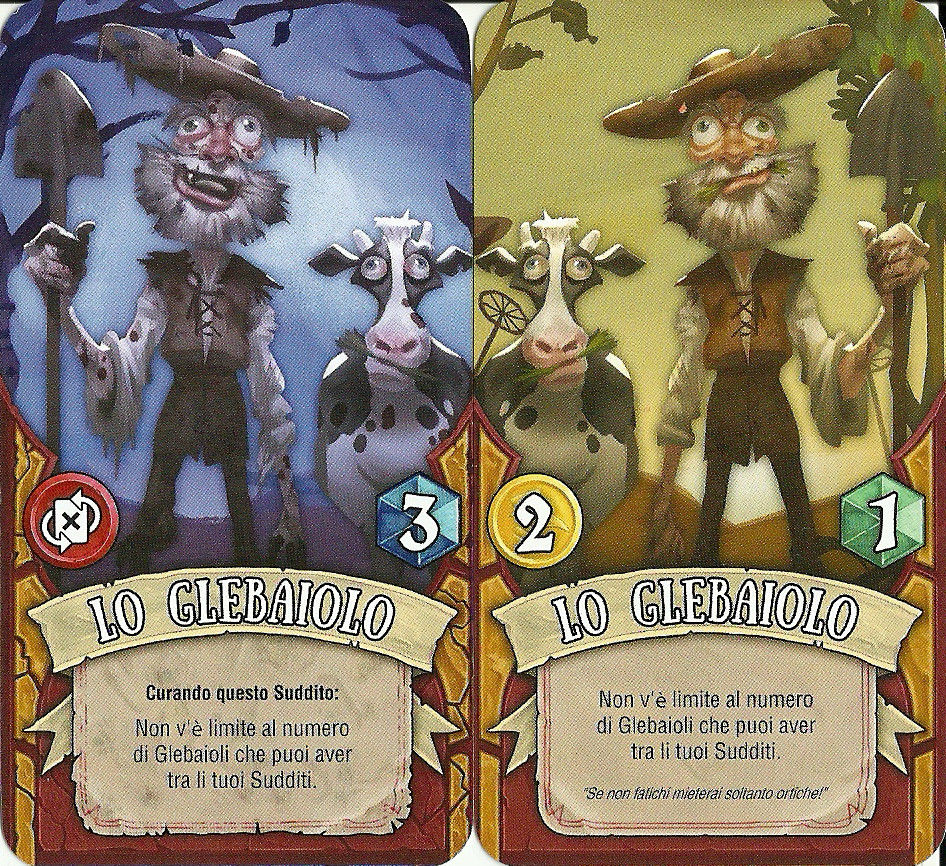 Vi sono anche tre mazzi di carte: Suddito, Risorsa ed Evento.