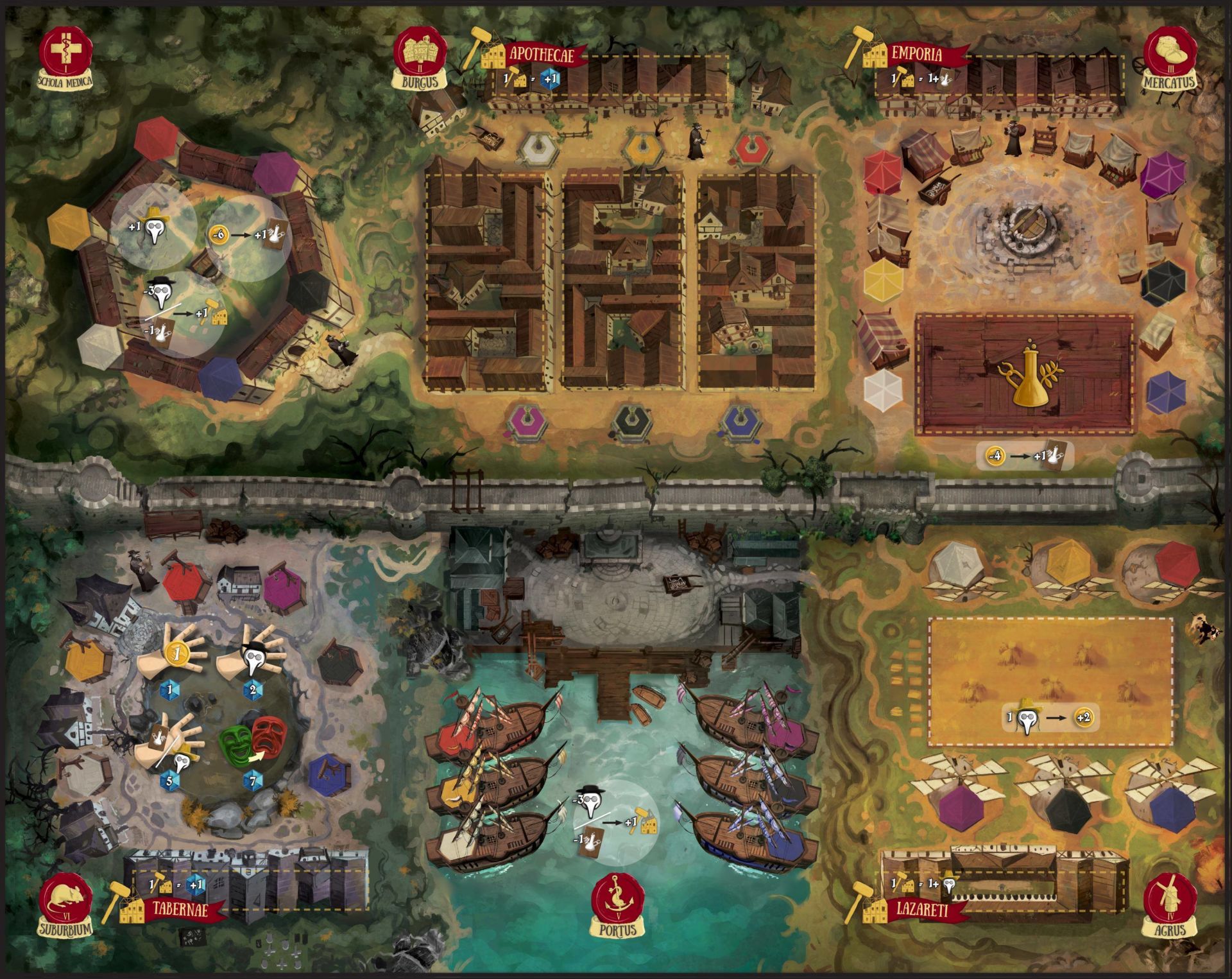 Schola Medica: il giocatore che ha investito di più in quest’area può compiere una tra le azioni che si possono compiere nell’area Portus, Mercatus oppure Agrus, a scelta. Si tratta di una sorta di “area jolly”.