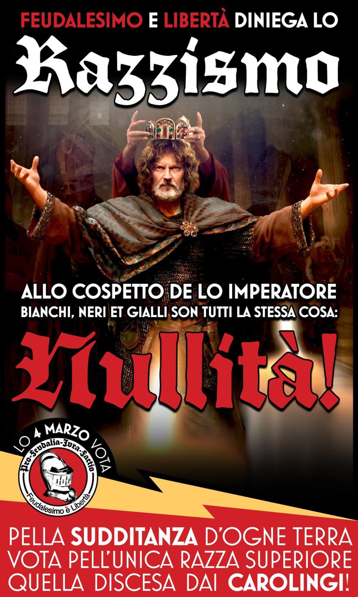 Un manifesto di Feudalesimo e Libertà in cui si ironizza sul Razzismo.