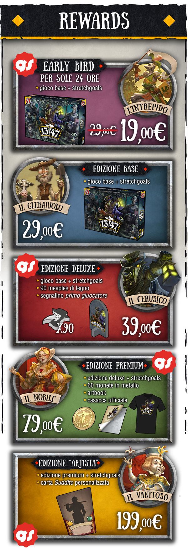 Uno dei vantaggi di sostenere la campagna è la possibilità di ottenere il gioco a prezzo molto più basso: la versione “early bird”. Il costo di questa versione dal numero limitato di copie è di 19 €. Solo i più veloci riusciranno ad accaparrarsela.