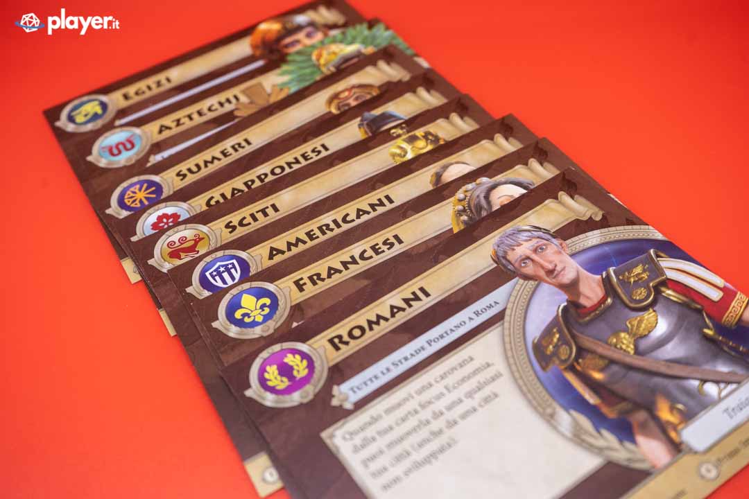 Ravanando nella scatola senza scomparti troviamo le schede di 8 leader con le loro abilità (Ahimé si tratta di quelli di Civilization 6 e non del 5). Dagli Aztechi ai Giapponesi, passando per Egizi e Francesi. Non può mancare il mio preferito, Cesare.