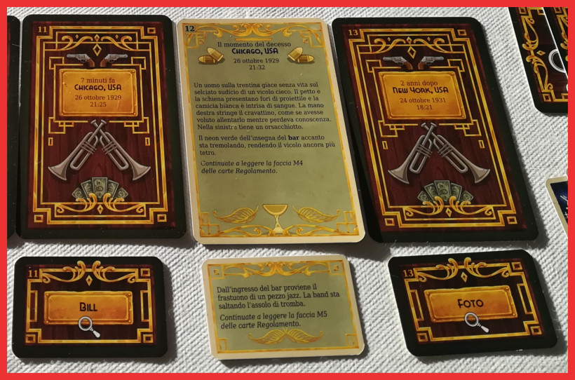 Prima di scegliere tra le tre alternative, possiamo spendere una carta con la lente d’ingrandimento (ne abbiamo 4) per leggere l’indizio corrispondente alla stanza che abbiamo scelto. In teoria dovrebbe aiutarci a prendere la decisione migliore.
