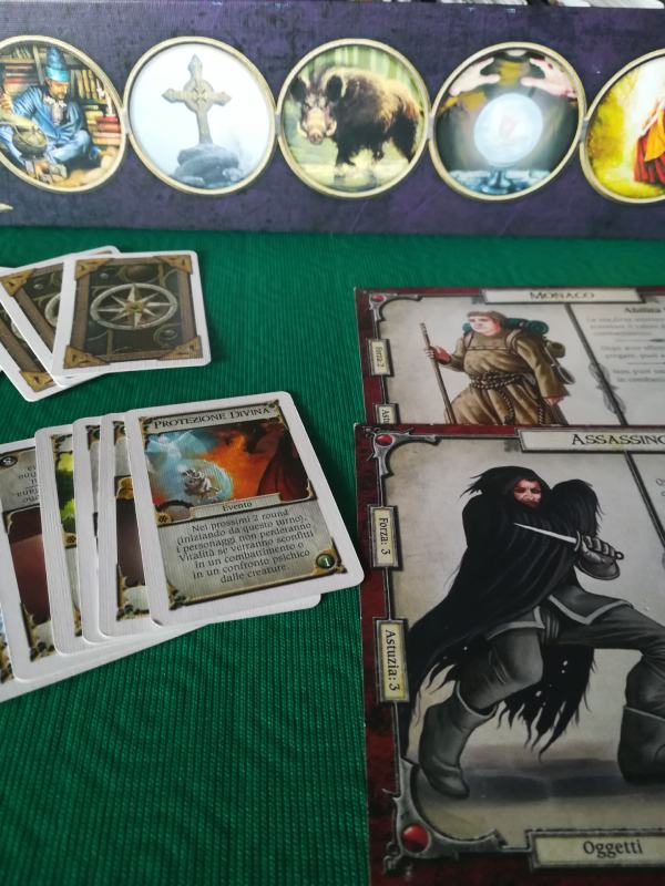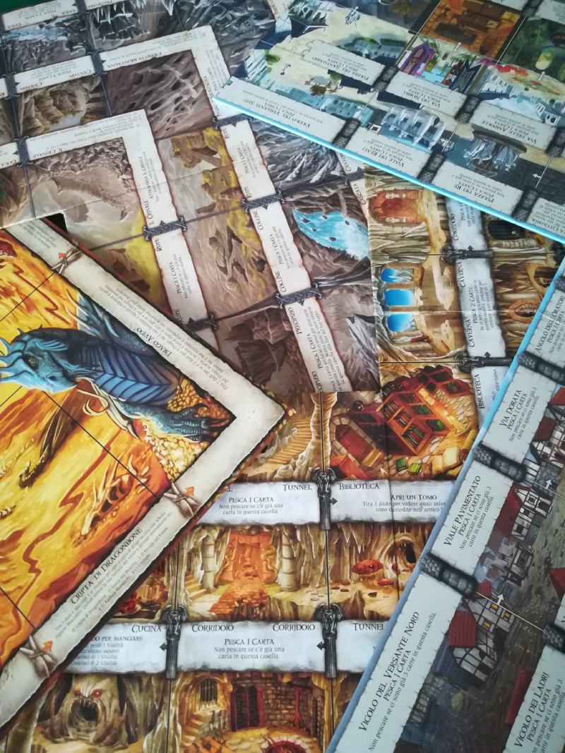 Normalmente le caselle fanno pescare delle carte che possono essere oggetti, luoghi, eventi e mostri. Altre caselle sono dei luoghi fissi in cui si tira un dado e se esce 1 succedono cose bruttissime, se esce 6 succedono cose simpatiche (mai bellissime sigh).