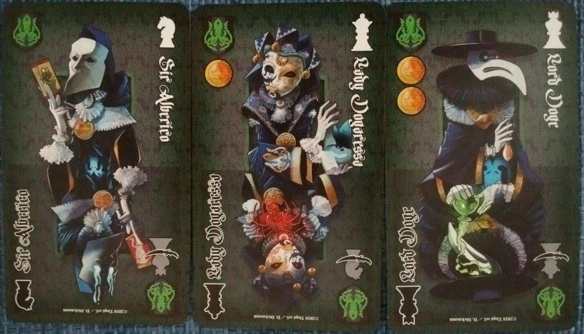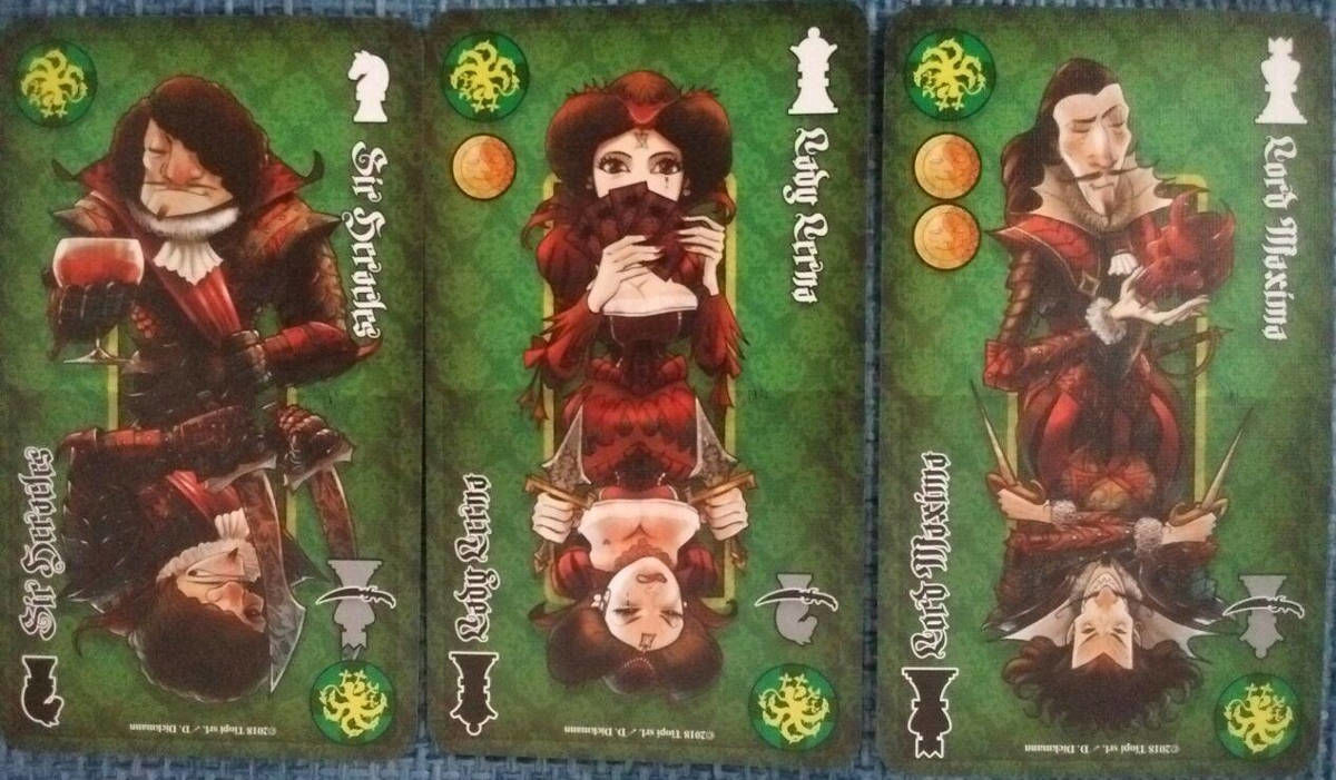 Ogni carta presenta due lati, uno chiaro, Smiles, e uno scuro, Daggers, con i quali il giocatore di turno potrà decidere se avere un approccio pacifico o aggressivo con un qualunque altro giocatore a sua scelta. Utilizzare la diplomazia ci permetterà di guadagnare monete d’oro, invece con il tradimento si potrà eliminare un personaggio e prendere le sue ricchezze, ma tenendo sempre a mente che per uccidere qualcuno bisogna rispettare una scala gerarchica.