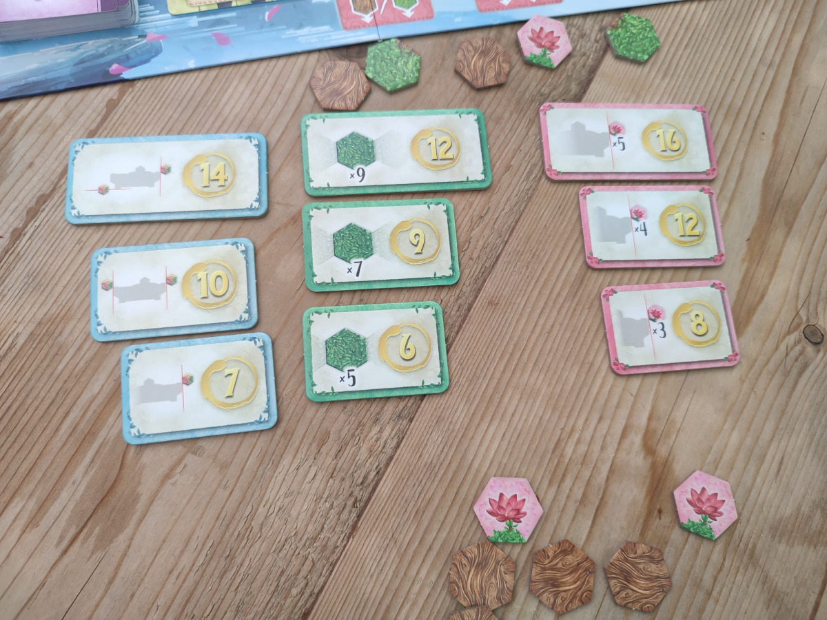 Si passa dai più semplici da ottenere, come “posizionare 8 tessere legno“, a quelli più ostici come “fai sbocciare X fiori sullo stesso lato del bonsai“. Naturalmente ognuna di queste etichette garantisce moltissimi punti e diventano l’obiettivo principale da raggiungere prima degli altri per ottenere un netto vantaggio.