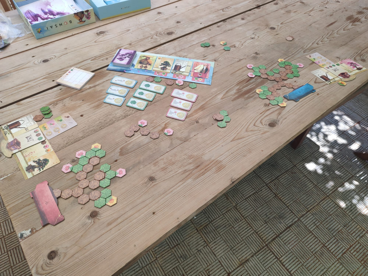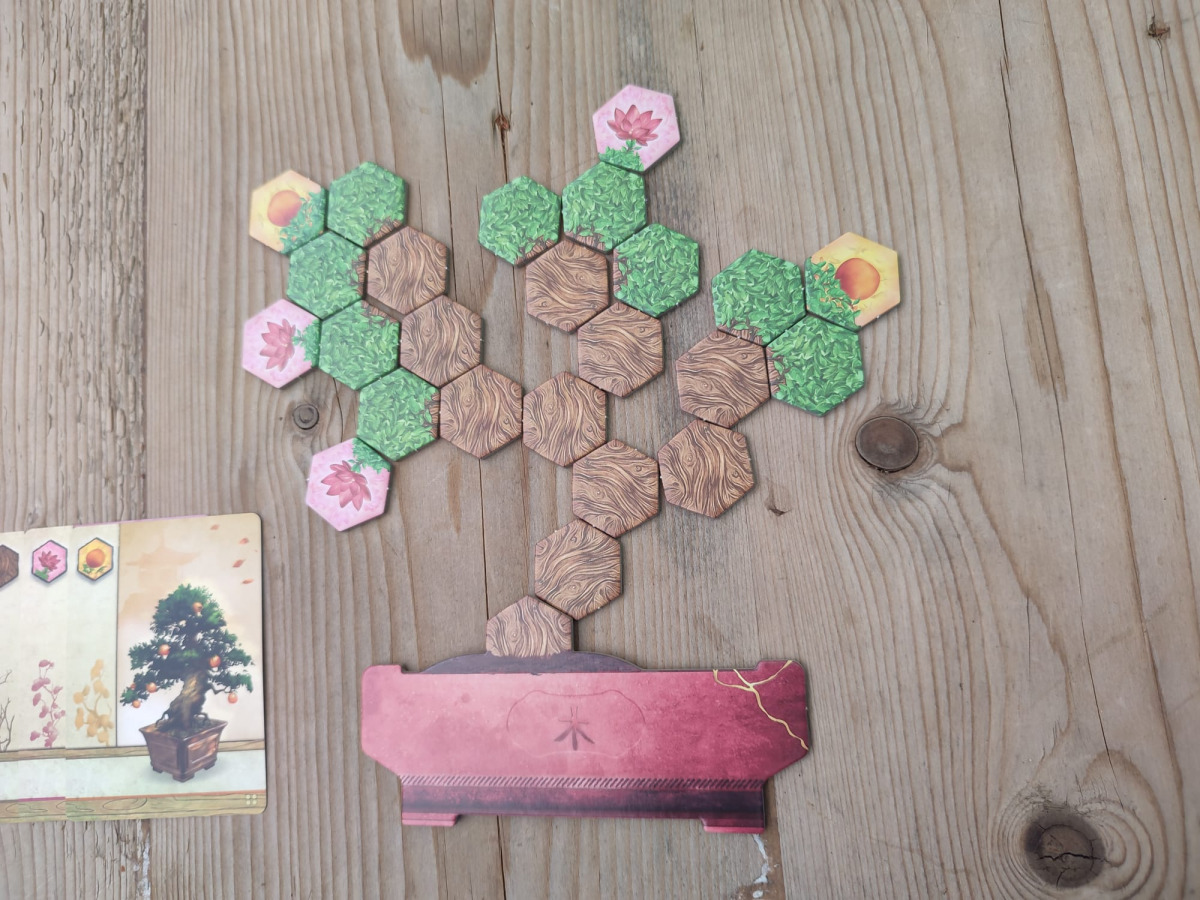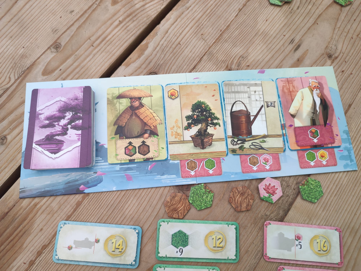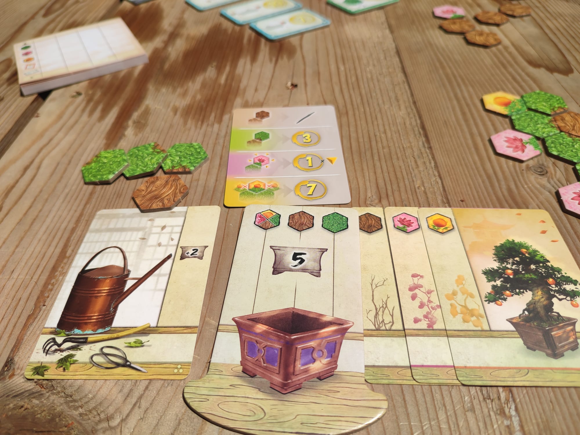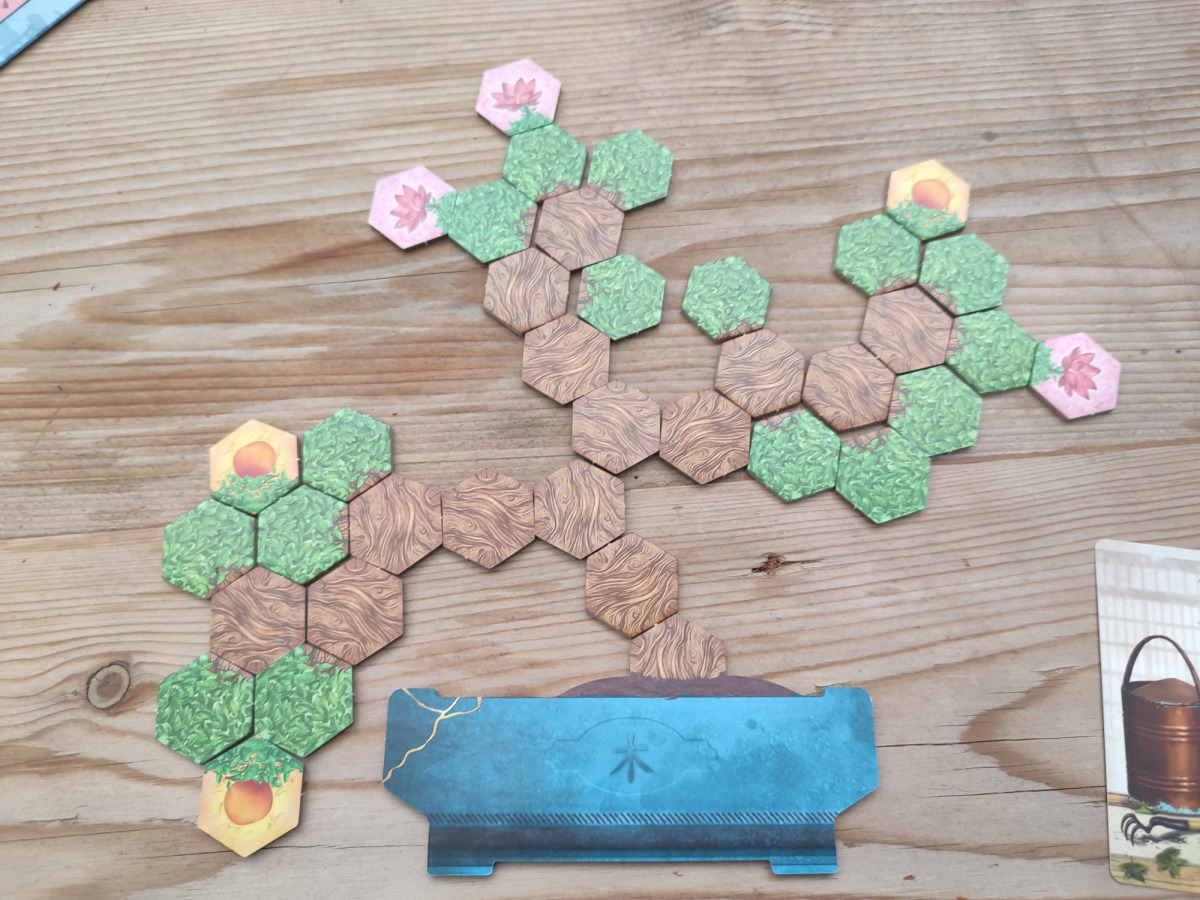 Del resto, anche aumentando di sole due unità la riserva non si sente più il bisogno delle carte “attrezzo” dal momento che si tende a non accumulare ed aggiungere pezzi al bonsai per raggiungere gli obiettivi prima degli altri. Soprattutto nelle fasi avanzate sia le carte “attrezzo” che le carte “pianta” diventano quasi inutili e vengono pescate solo per il bonus di tessere che offrono.