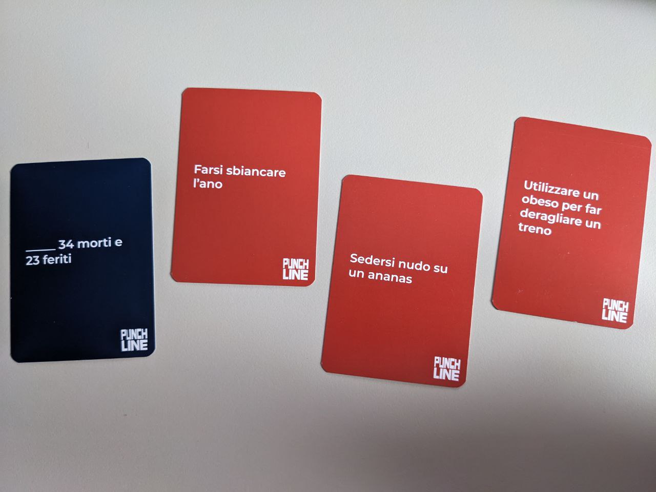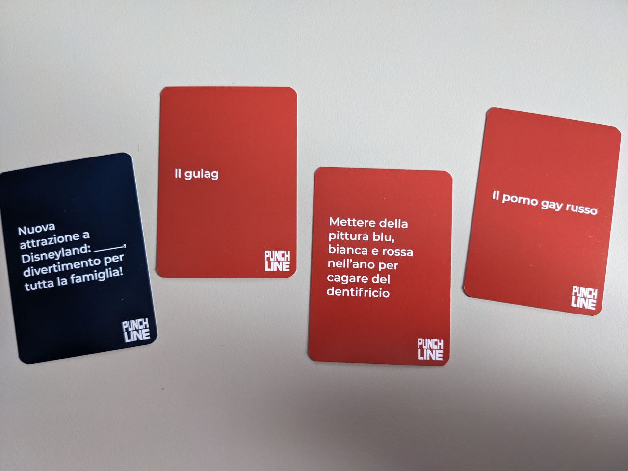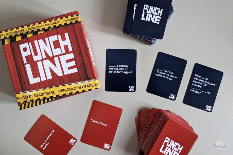 Ispirato dal celebre “Cards Against Humanity” – da cui forse riprende un po’ troppo, comprese carte di cui crea la versione meno divertente – Punchline prevede che ogni giocatore riceva una serie di carte risposta (carte rosse) per rispondere alle carte domanda (carte blu) che il giocatore scelto pescherà a turno. Questo giocatore, detto “Boss”, non potrà giocare una risposta per la domanda pescata ma dovrà invece rileggere la domanda inserendo a ruota, nello spazio apposito, la risposta fornita dai giocatori. L’abbinamento che risulterà più divertente sarà quello vincente e il giocatore che avrà dato la risposta vincente diventerà il nuovo “Boss”. Il gioco procede fino a quando un giocatore non avrà raggiunto i 5 punti, o a oltranza, dipende quanti amici si sono alzati indignati dal tavolo.
