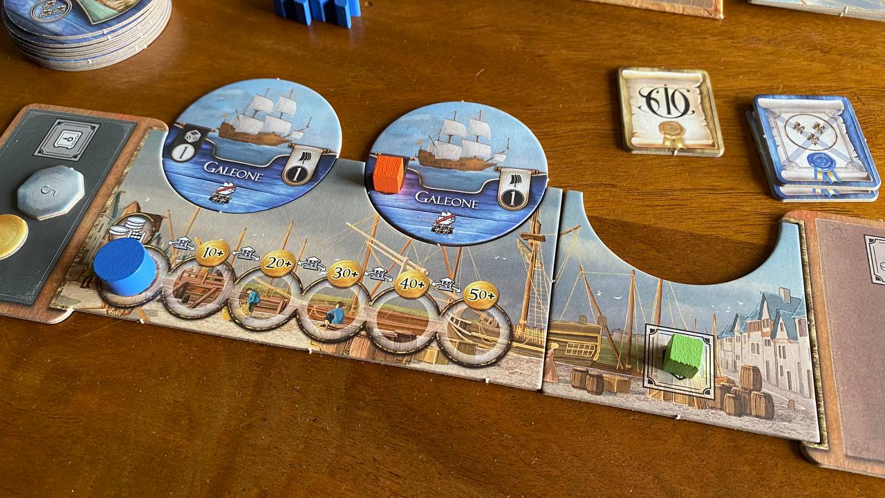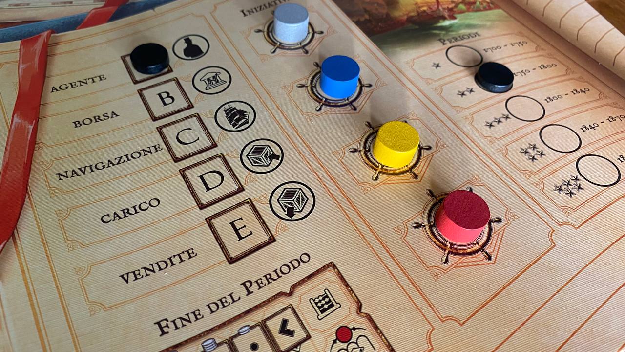 Infine vanno preparate le carte dei due mercati, da separare in 3 pile distinte ciascuna in base al periodo storico di riferimento, e le plance dei giocatori con 2 galeoni e le monete iniziali. Sul tabellone, infine, vanno posizionate le risorse nei mercati, i segnalini dei giocatori sull’indicatore dell’iniziativa e sul tracciato della borsa, le azioni nello spazio della borsa e le pedine nere che gestiscono periodi e fasi di gioco.