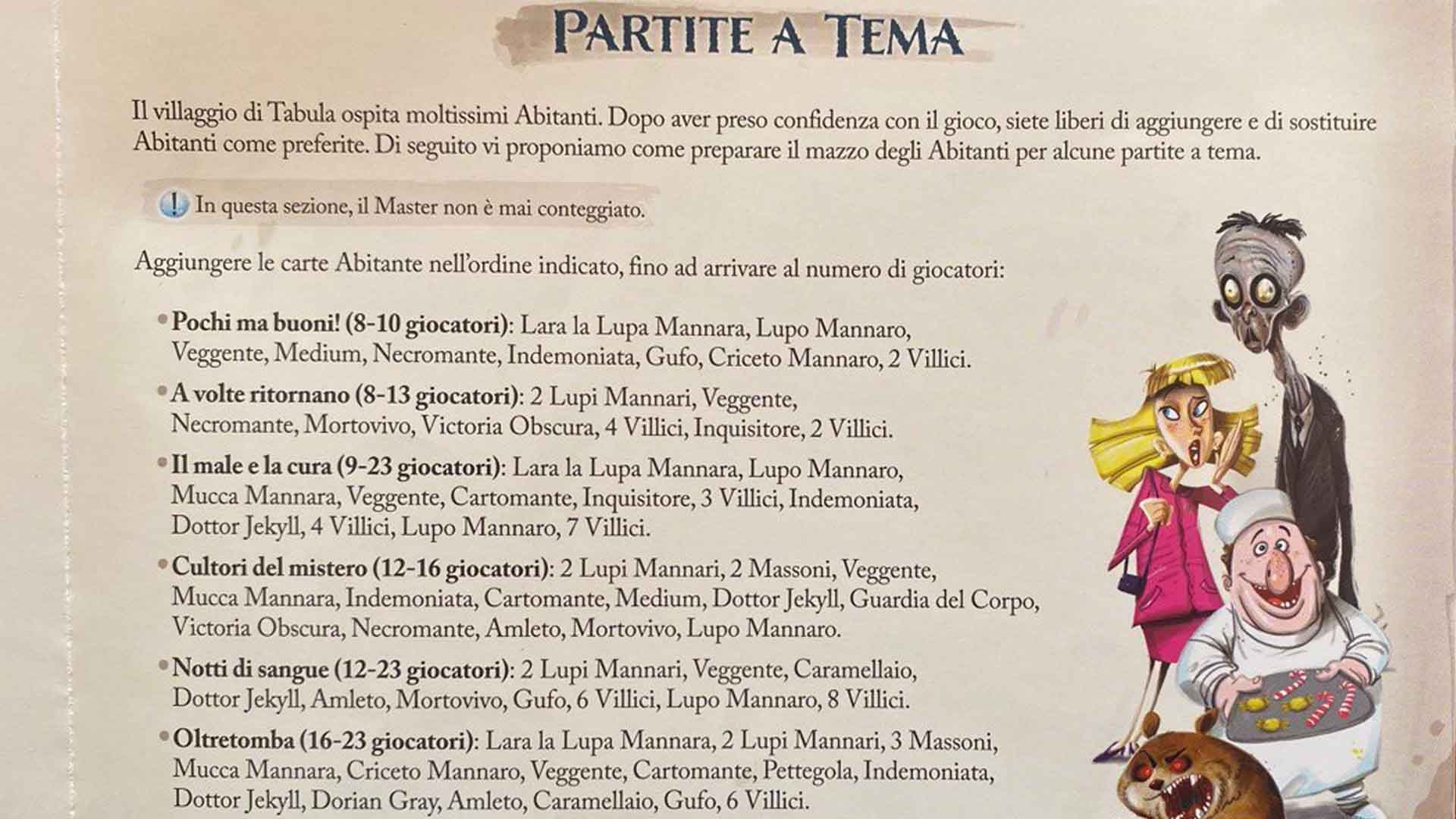 Tra le tante varianti di gioco suggerite, personalmente ho provato alcune partite a tema consigliate: la modalità A Volte Ritornano mette in gioco praticamente un sacco di personaggi in grado di riportare in partita dei giocatori (inclusi sé stessi, come il Mortovivo), mentre la modalità Battle Royale mette in scena il caos totale con troppi pochi villici puri senza poteri.