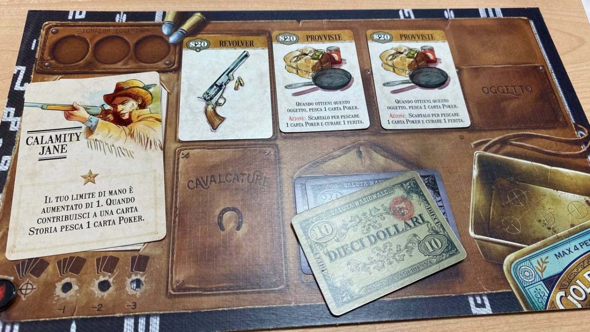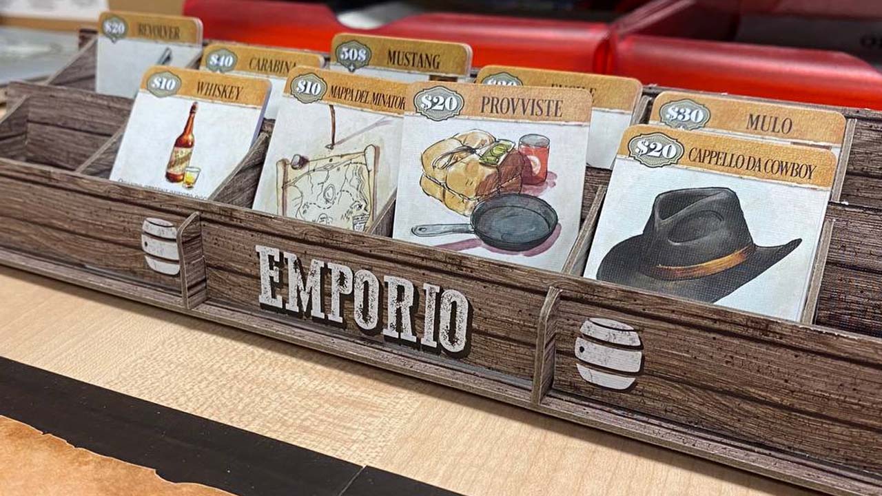 Tra le finezze estetiche ci ha fatto impazzire l’emporio che invece di essere un’area sul tabellone dove posizionare le carte da acquistare, è in realtà un vero e proprio scaffale porta-oggetti da assemblare a mano (ovviamente si monta solo la prima volta). Interessante e giusto anche che le azioni da svolgere nel vecchio west vengano decise dalle carte francesi, le stesse che si possono utilizzare anche in effettive partite a poker!