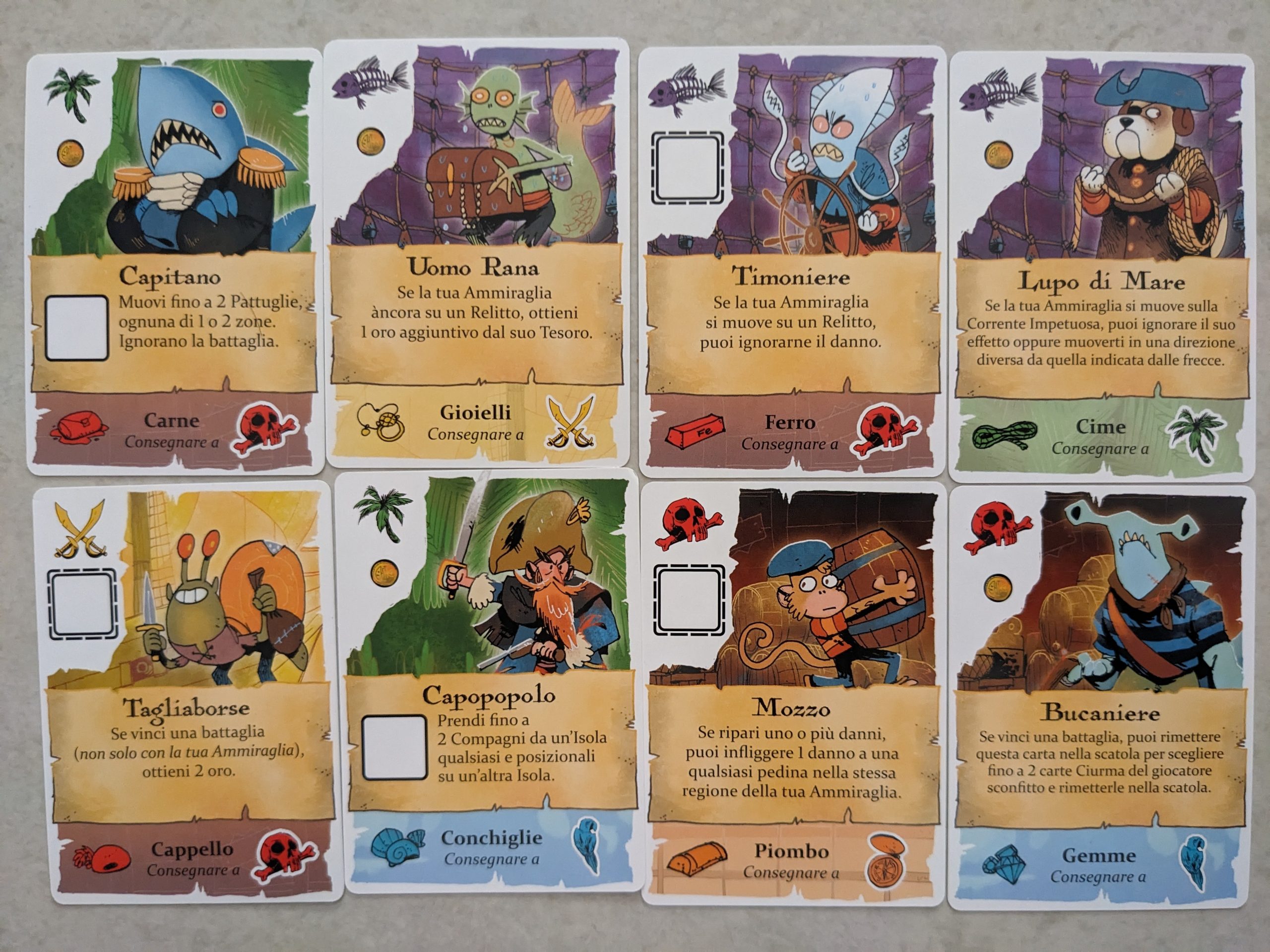 Oltretutto possono posizionare compagni anche su territori molto lontani dall’ammiraglia e cambiare le sorti del round in un soffio. Nel combattimento non sono una potenza ma possono ricorrere a delle Carte Piano, da giocare in battaglia – come la carta MANCATO! che gli permette di evitare le cannonate per quella battaglia – con cui sfuggire dalle situazioni più complesse. Hanno anche due navi extra, Cutter e Cannoniera, che possono entrare in gioco per aumentare il controllo delle regioni e le possibilità di vincita in battaglia.