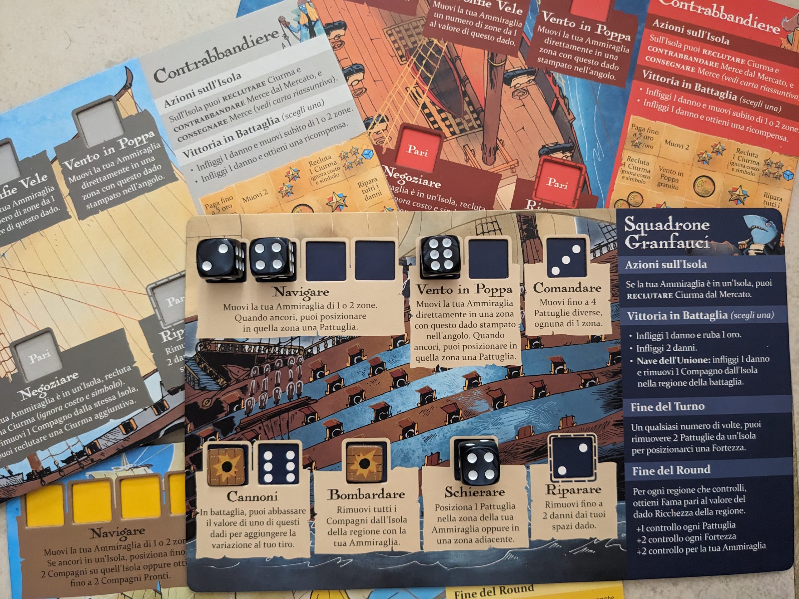 Ogni turno ogni giocatore dovrà tirare una manciata di dadi che andranno poi posizionati sulla sua personale plancia. Questi diventeranno una componente fondamentale del gioco e saranno proprio loro i “motori” che permetteranno di far muovere la nave esplorando le isole, caricare i cannoni per attaccare gli avversari e dare fondo alle particolari abilità di ogni fazione. I turni proseguono finché si hanno dadi da posizionare, poi si passa al conteggio fama e al nuovo round.