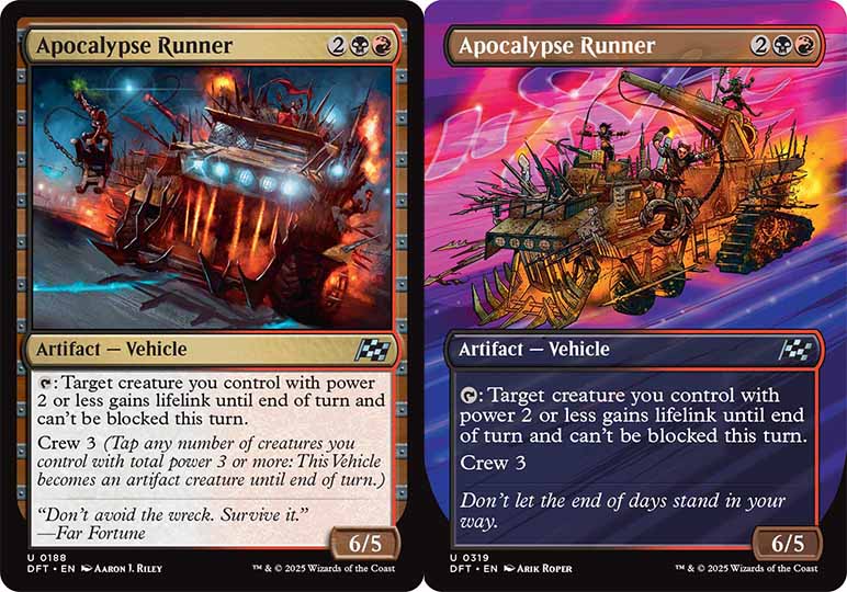 Chiaramente ispirati all’universo narrativo di Mad Max, sono bande e predoni del piano apocalittico di Gastal pieno di raffinerie, scorpioni giganti, signori della guerra e draghi. Si tratta di un nuovo piano introdotto in Aetherdrift ma che, secondo la lore, fu scoperto durante la seconda invasione di Phyrexia. Con il loro piano in rovina, gli Endriders, capitanati da Far Fortune, sono mercenari sugli altri piani in cambio di benzina con cui alimentare le proprie macchine e risorse fresche e pulite come l’acqua. Vincere il Gran Premio significherebbe per gli Endriders salvare Gastal dall’apocalisse.