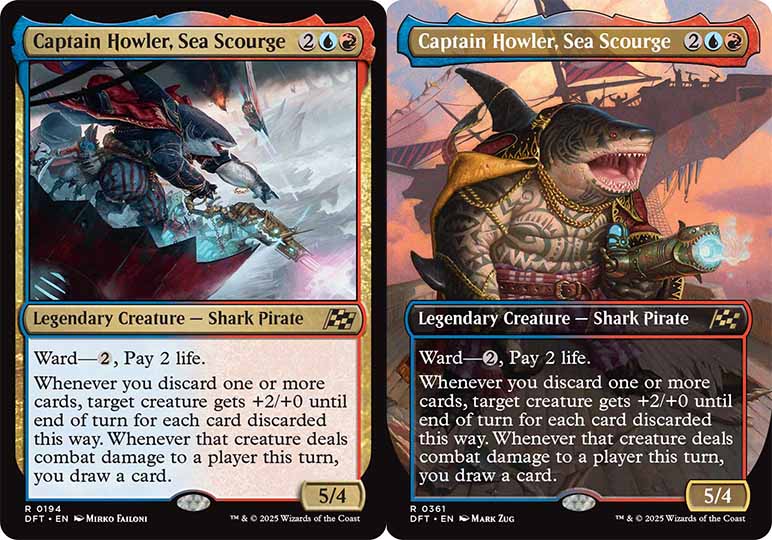 Veniamo ora alla parte succosa di Aetherdrift: le carte. Ogni team in gara ha le sue caratteristiche culturali, estetiche e di gameplay. Tutte questo influisce anche nella rappresentazione grafica delle carte, che hanno illustrazioni con stili molto diversi tra loro, risultando in una mescolanza un po’ strana di impressioni e sensazioni, unite dal filo conduttore unico delle gare. Si passa continuamente da scenari alla Mad Max ad ambientazioni più futuristiche, quasi alla Akira, passando a corse tra velieri volanti e in navicelle spaziali. Non ho ancora capito, personalmente, se sono convinto da questo bel minestrone di estetiche, ma valuterò questo dettaglio carte alla mano (e su Magic Arena).