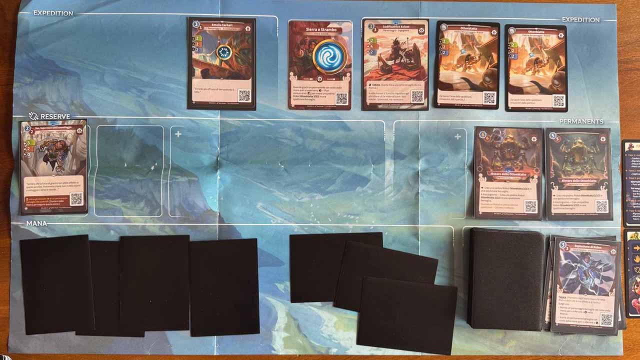 Altered è un gioco di carte collezionabili con turni che sono dinamici: un’azione a testa in alternanza tra i giocatori finché non termina il mana a disposizione da tappare per attivare carte e abilità. Come accade con Star Wars Unlimited e, lato Ravensburger, con Disney Lorcana, anche Altered prevede l’utilizzo delle normali carte come riserva di mana, posizionandole coperte in un’area apposita del campo di gioco.