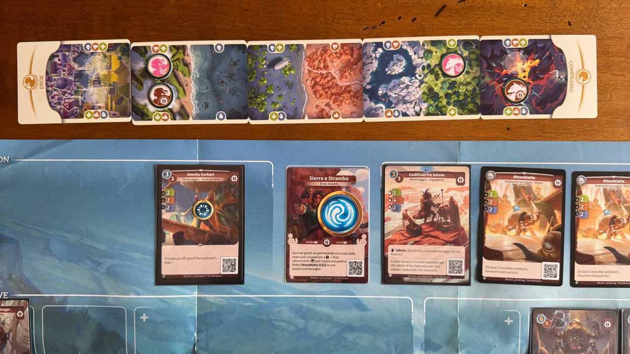 Il campo di gioco è suddiviso nella parte superiore principalmente in due aree dove posizionare le carte: la Spedizione dell’Eroe, su un fianco della Carta Eroe, e la Spedizione del Compagno, sull’altro fianco. Le carte che vengono giocate in una o l’altra area, avranno punteggi da calcolare a fine round che influenzeranno esclusivamente il percorso dell’Eroe o del Compagno. Inoltre, oltre all’area dedicata al Mana, sono presenti anche due aree aggiuntive al centro: i Fulcri, dove apporre delle carte permanenti, e la Riserva, dove le carte giocate nelle Spedizioni vanno a riposare per poter essere giocate – eventualmente – un’ulteriore volta in un round successivo.