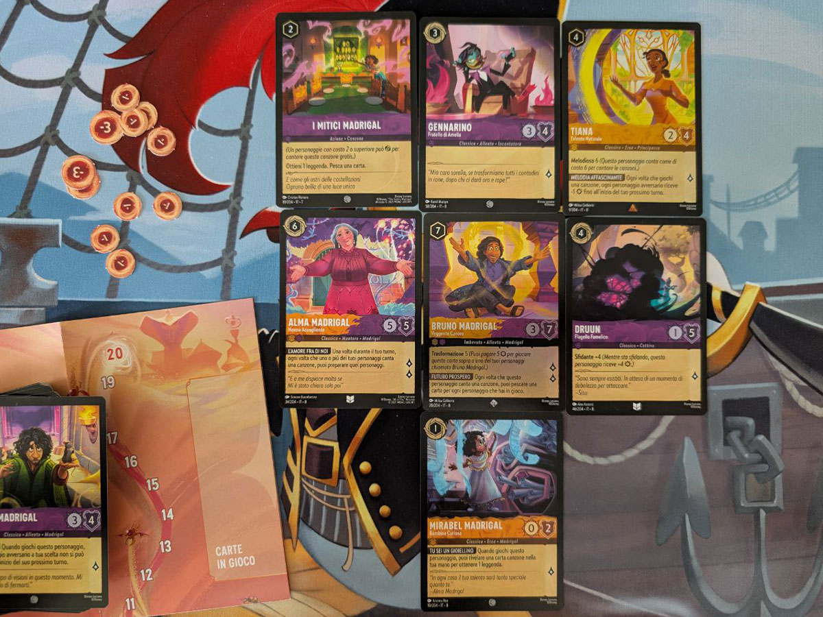Questo mazzo non si discosta troppo dalle strategie già viste in questo tipo di inchiostri, ma segna il grande ritorno della famiglia Madrigal con una Mirabel che permette di rivelare una canzone dalla mano per guadagnare lore, l’azione I mitici Madrigal che punta alla pesca e al guadagno di lore, Bruno Madrigal doppio inchiostro che quando canta una canzone fa pescare carte per ogni personaggio in gioco e Alma Madrigal che fa preparare i personaggi che cantano una canzone.