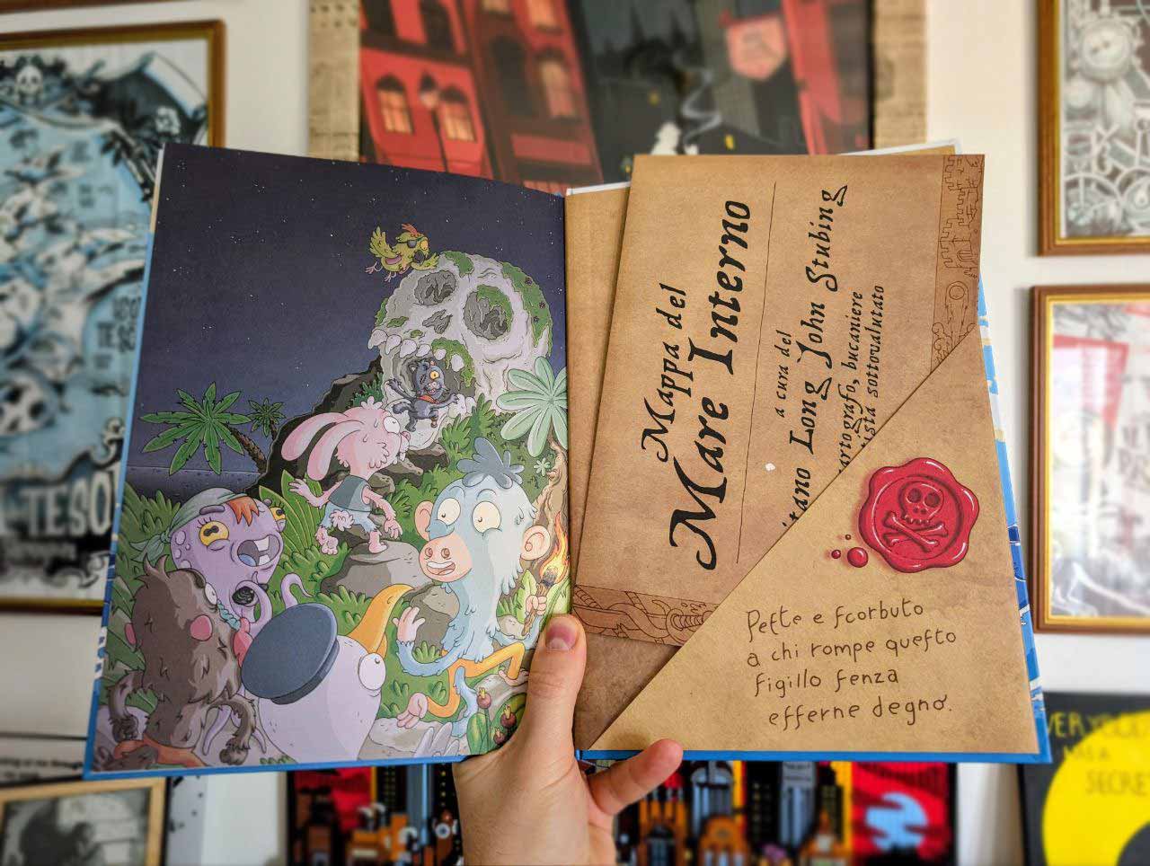 Infatti, come se giá non bastassero le avventure di Bill, i bizzarri personaggi che spuntano da una pagina all’altra e le gigantesche doppie pagine ricche di segreti, a calare il lettore ancora più in profondità nell’atmosfera piratesca c’è anche una mappa navigabile inserita in una tasca apposita nella copertina del libro.