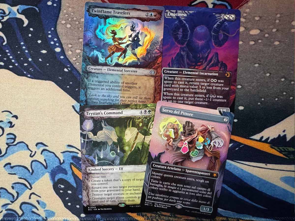 Per riflettere l’atmosfera fiabesca dell’espansione, è stato introdotto un nuovo stile chiamato Bordo Fiaba, dove sia l’illustrazione borderless chee la cornice del titolo della carta e della sua descrizione rievocano proprio una dimensione da favola. Non mancano anche delle varianti Japan Showcase in cui lo stile diventa anime, e delle special guest con illustrazioni borderless alternative (Potete scorgere un Servo del Pittore di Ryan Riller nella foto in basso).