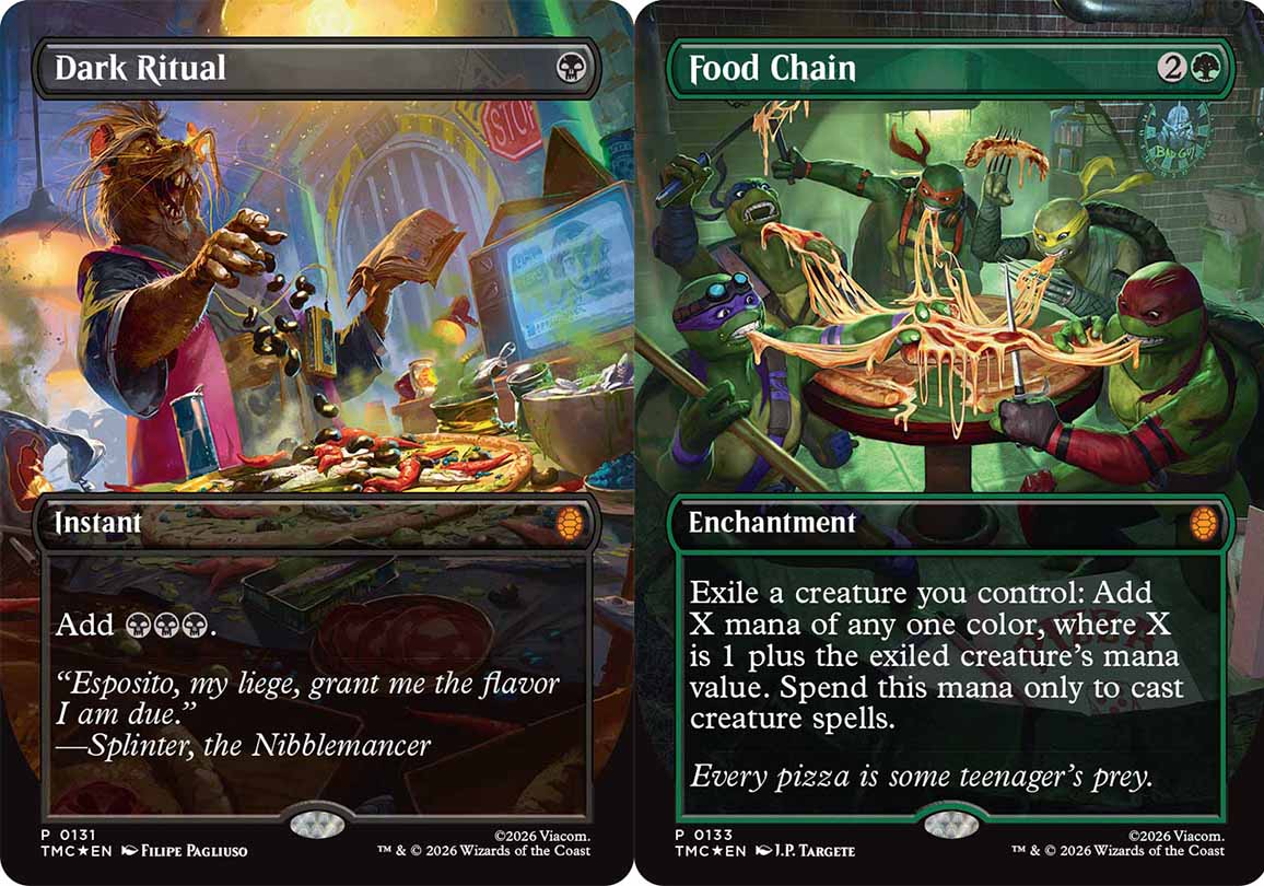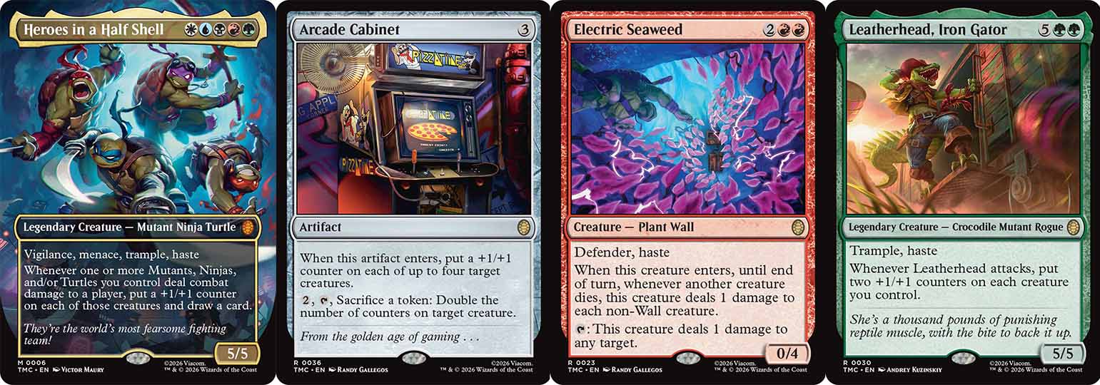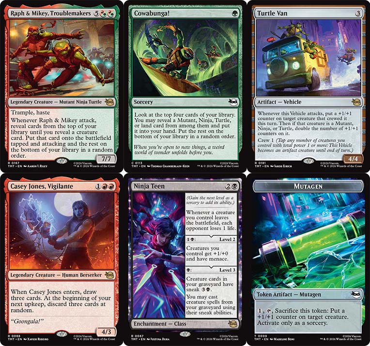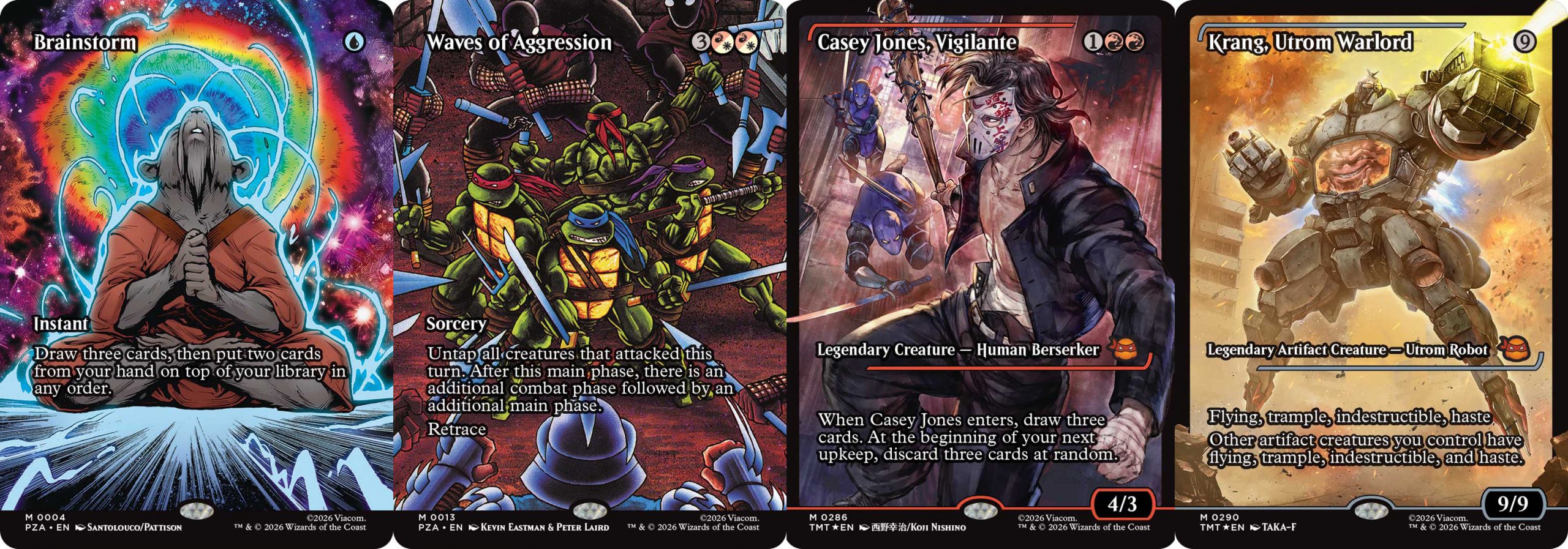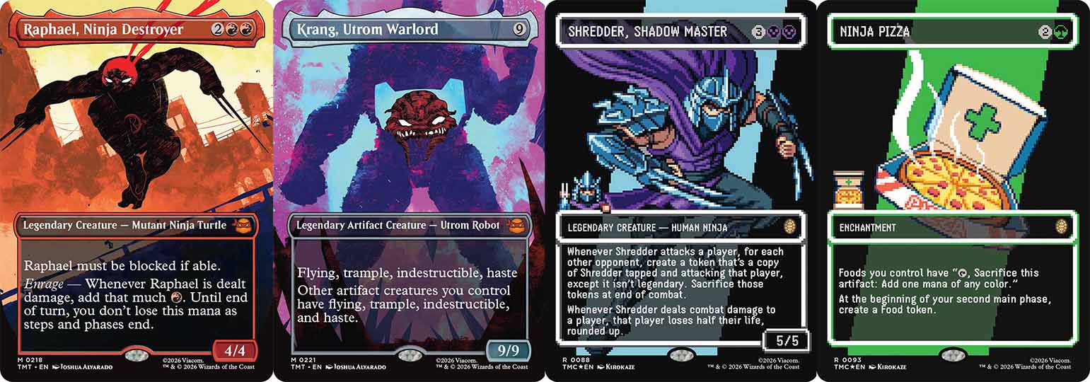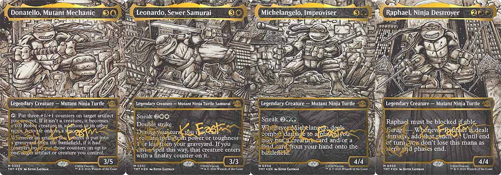 Una serie di carte borderless realizzate da Kevin Eastman in persona, co-creatore delle Tartarughe. Sono pensate come vere “headliner”, disponibili solo nei Collector Booster, e rappresentano uno dei massimi richiami per i collezionisti..