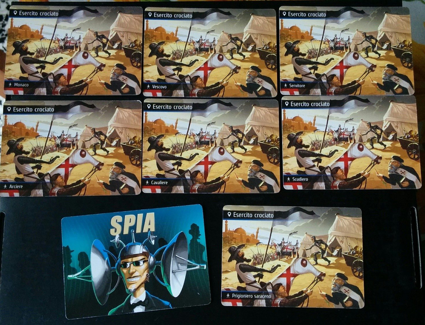 Ad ogni round, a ciascun giocatore viene data una carta presa da uno dei trenta mazzetti, raffiguranti i diversi luoghi del gioco. Tutte le carte distribuite tranne una, mostrano un luogo e uno specifico ruolo di persona che si trova in quel luogo. E poi c’è la carta Spia, che viene sempre data a prescindere dal numero dei giocatori ed è uguale in ogni mazzetto.