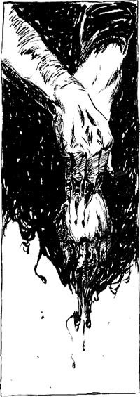 Posso però dirvi questo: il tratto è appena accennato, quasi più macchie che linee, in primo piano distinguiamo una figura femminile, il male, vestita in abiti palesemente di etnia africana, in secondo piano campeggia una figura umanoide, il bene, che levita a mezz’aria con le braccia tese a ricordare una croce, mentre tutt’intorno macchie nere ondeggiano nell’aere.