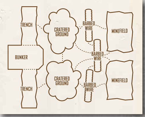 Il secondo riguarda la rappresentazione dell’area di battaglia. In Mutant Chronicles gli spazi non sono calcolati in base a misure reali ma sono schematizzati in Zone, ogni zona ha delle caratteristiche che la rendono diversa da quelle con cui confina, di conseguenza le gittate sono divise in Close, limitata alla zona in cui ci si trova, Medium, limitata alle zone limitrofe alla propria, Long, due zone oltre la propria, Extreme, tre o più zone oltre la propria. Questa schematizzazione, che si utilizza sia per il movimento che per la gittata delle armi, permette di avere una veloce idea della distanza raggiungibile dalle armi e dal movimento.