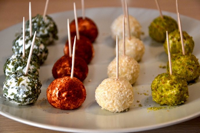Servite le palline su un vassoio accompagnate da cracker, crostini, grissini o del pane tostato.