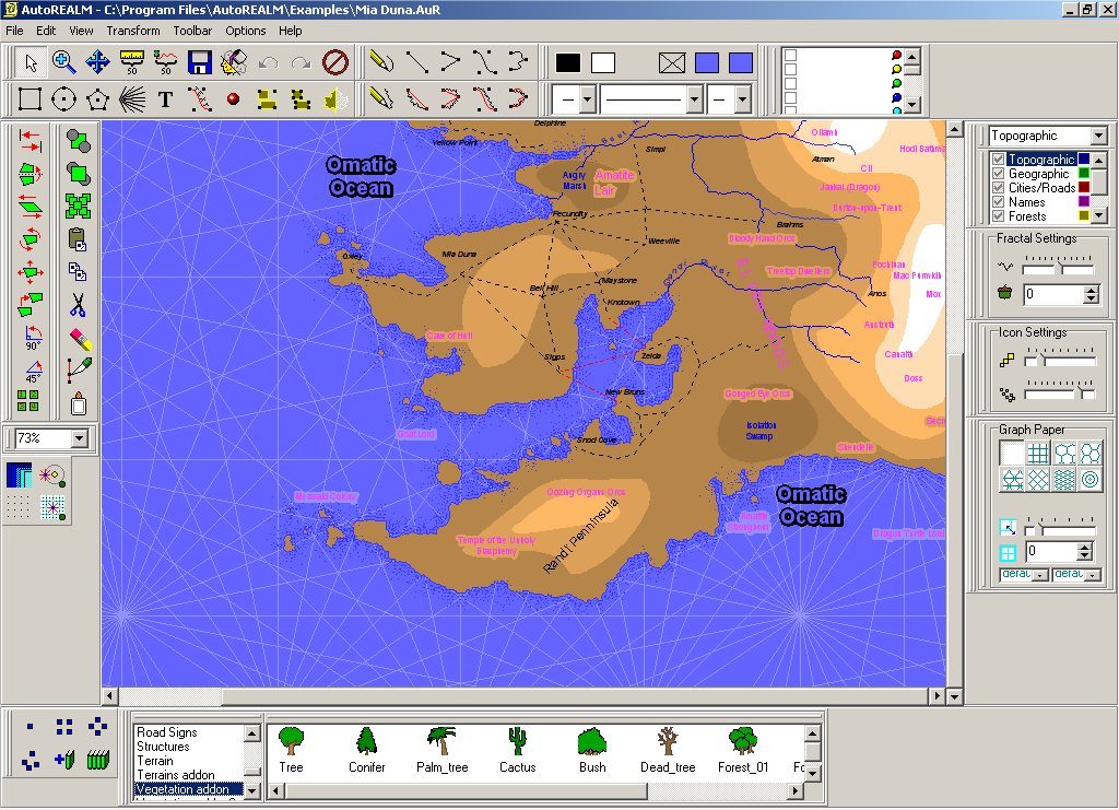 Se volete un “tool” completo, con una grande possibilità di personalizzazione delle mappe, AutoREALM è quello che fa per voi. Si tratta di un programma di grafica vettoriale, con molteplici strumenti di disegno e di misurazione, oltre a fornire librerie complete di simboli per le vostre mappe. Sicuramente l’utilizzo non è immediato o automatico come per altri programmi, ma con un po’ di pratica si possano fare degli ottimi lavori. Non ci sono limitazioni di alcuna sorta: AutoREALM è perfetto sia per creare mappe di ambienti interni, che cartine per regioni, continenti o mondi interi. Unica pecca: la grafica molto sciatta, se paragonata alla concorrenza. Conviene utilizzare dei programmi per abbellire le cartine in un secondo momento, come spiegato nell’ultimo punto di questo articolo.