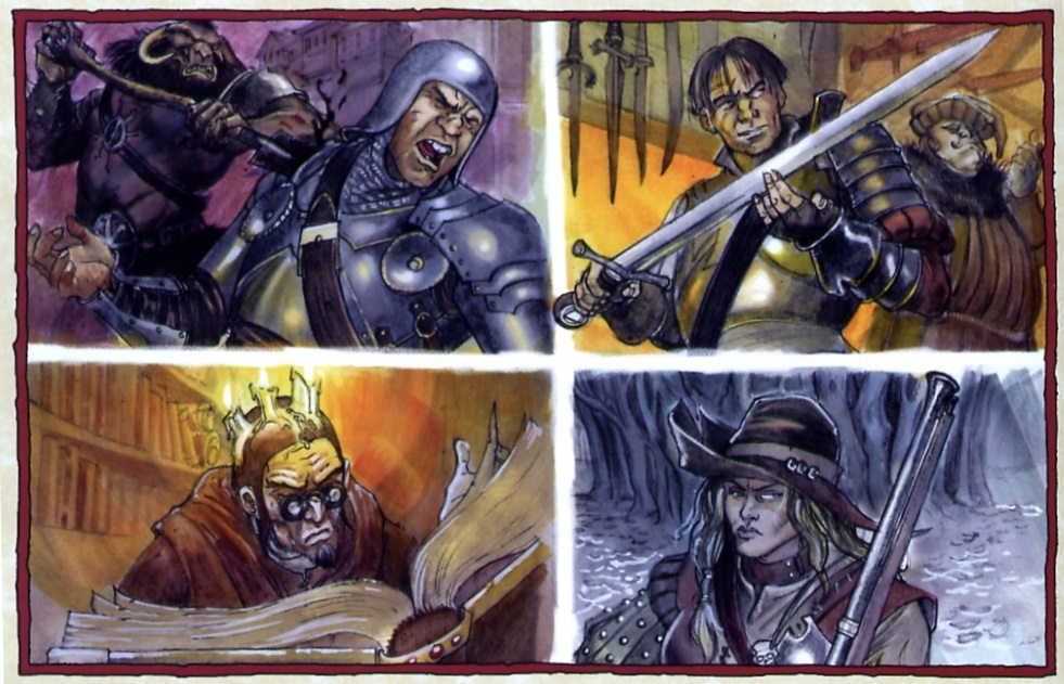 Questo può essere un consiglio banale, ma lo diventa meno se considerate il numero di supplementi pubblicati. Pensare di leggere tutto lo scibile su Warhammer non è utopico quanto leggere quello su D&D, ma sicuramente arduo e, a mio avviso, inutile. Personalmente suggerisco, oltre all’eccellente e ovvio manuale base, i seguenti volumi che ne sono il naturale completamento: Kit dell’Arbitro di Gioco, con un’avventura completa e materiali utili come luoghi già pronti tipo villaggi o locande, Bestiario del Vecchio Mondo, indispensabile per colmare le, ahimè, ampie lacune del manuale base, Armi & Armature, un ottimo supporto per tutti i giocatori e i master, anche solo leggendo l’elenco dell’equipaggiamento presente, possono nascere spunti di avventura spontanei o risposte ai desideri dei personaggi più smaliziati, ed infine il Compendium, che approfondisce aspetti come il mercanteggiare o la legge, ed inoltre descrive alcune città come Sartosa, la città dei pirati, e Tobaro, la città dei pazzi.