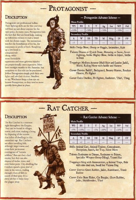 Una volta individuate le statistiche e quindi il profilo base del proprio personaggio , si passa alla scelta della carriera, anch’essa casuale e basata sul lancio di un dado da cento su un’apposita tabella, ed è qui che c’è l’innovazione del gioco, ovvero non esistono classi vere e proprie ma una serie disparata di professioni che vanno dall’acchiappa topi al guardiacaccia passando per il mercenario e l’apprendista mago. Ognuna di queste carriere permette di apprendere varie abilità e talenti oltre ad aumentare alcuni degli attributi del profilo base del PG come ad esempio il numero di attacchi o il livello di magia.