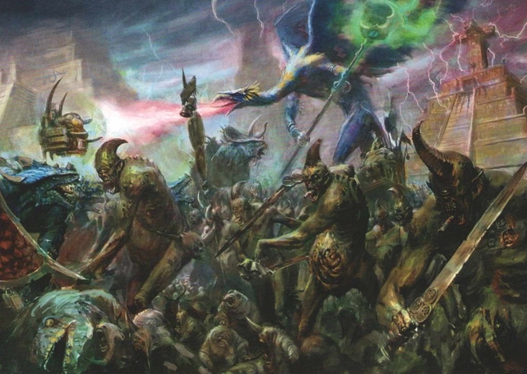 Gli Uomini Lucertola, abitanti della Lustria e diretti discendenti degli Antichi. Vivono in antiche città costruite ai tempi degli Antichi divisi in un rigido sistema di caste al cui vertice sono i Maghi Sacerdoti Slann. Vivono difendendo le antiche vestigia di ciò che erano un tempo e seguendo i dettami dei loro antichi creatori ormai scomparsi.