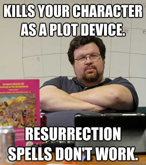 L’annosa questione della ragazza del Master si riproporrà eternamente. Il Master che fa differenze nel trattamento dei giocatori seduti intorno al tavolo manca di rispetto a tutti e allo spirito del gioco. Il peggiore è il Master che evita la morte di alcuni personaggi e fa carne da macello di altri. La scusa più comune è che certi giocatori “prendono male” la morte dei personaggi, mentre altri sono più ragionevoli. Per venire in soccorso delle povere anime che non sanno gestire la morte del PG si dovrebbero scrivere saggi di psicologia comportamentale. - Cliché