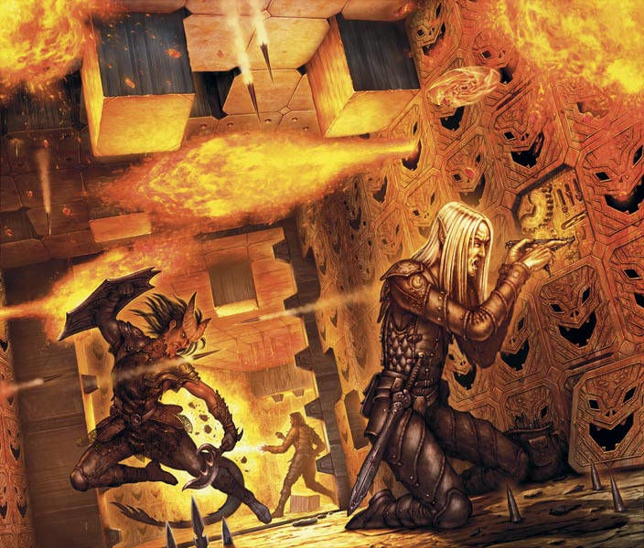 Ad esempio, in un ambiente con fumi altamente corrosivi e tossici, tra le Complicazioni si potrebbe avere la rottura di un pezzo di equipaggiamento, o il subire un livello di Affaticamento se non si supera un Tiro Salvezza. Oppure il collasso di un passaggio. In un dungeon che si sta allagando, potrebbe aumentare il livello dell’acqua (e rendere inaccessibile un’ulteriore zona).