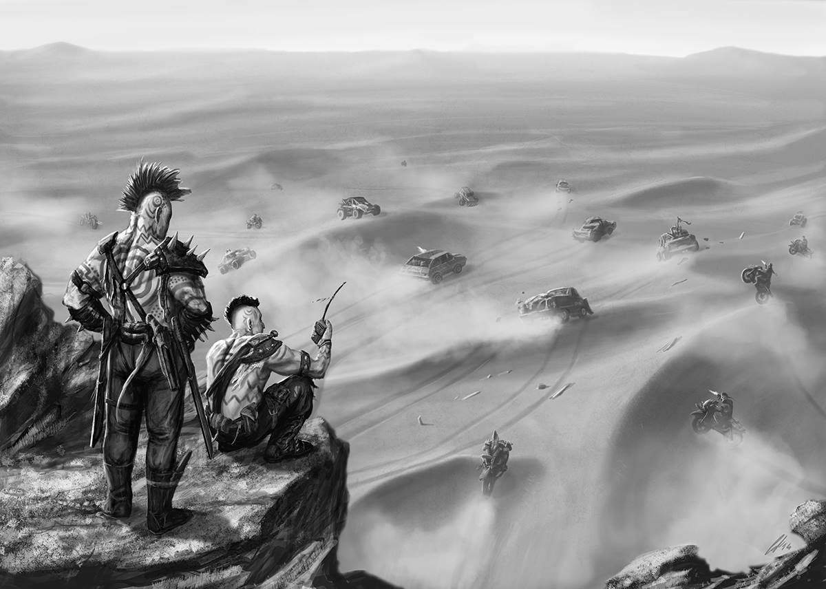 Qualche borraccia ancora piena, un po’ di carne nello zaino ma poco altro. Siete alla caccia di un temibile gruppo di fuorilegge (5 Fruganti p.254) scappato a piedi attraverso la landa desertica. Sono bene armati.. con il vostro armamento! Ve l’hanno rubato la notte prima ma qualcosa a quanto pare vi è rimasto. L’importante è ritrovarli prima che riescano a raggiungere i loro compari (2 Iene p.252) con un furgone a due giorni di distanza.