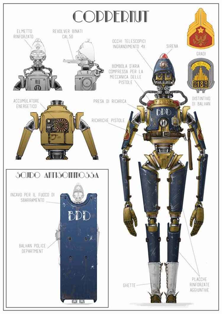 In aggiunta alle suggestive illustrazioni che ci accompagneranno nella lettura del manuale, al fondo del manuale troveremo un intero artbook. Le ultime pagine ci aiuteranno a immergerci ancora di più nell’atmosfera di Balhan City: impareremo come funzionano i diversi robot che girano per la città e le parti che li compongono. Ci verranno mostrati i vari modelli degli eccentrici brighat, gli abbigliamenti in voga in questa elettrica città e i vari veicoli e marchingegni che incontreremo per le strade. L’ultima sezione dell’artbook è dedicata ai loghi delle varie società presenti nella città.