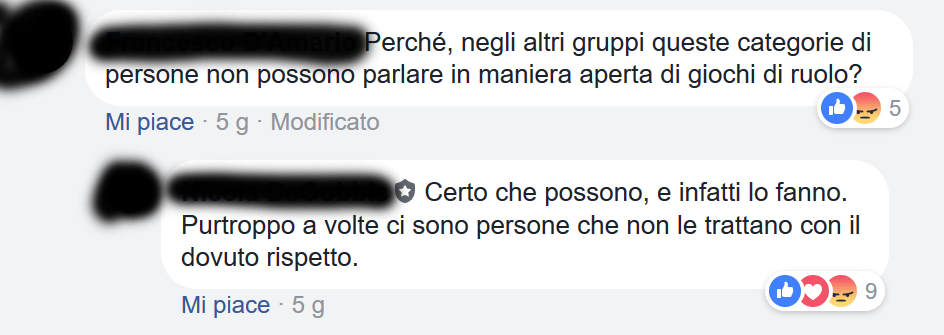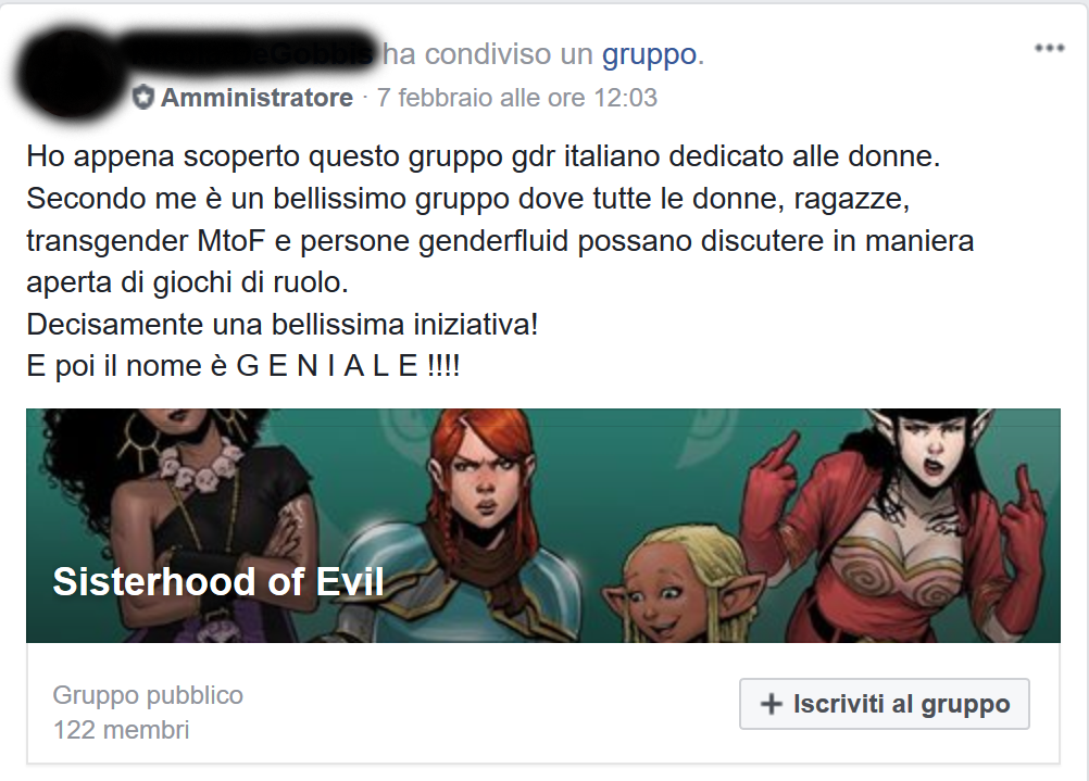 Il punto è che io non ho creato un ghetto, non è un gruppo privato solo per noi dove nessuno può vedere nulla. I post sono pubblici, si può mettere “mi piace” e gli stessi post possono essere ricondivisi. Quasi tutte le donne che sono nel gruppo sono anche in uno o più gruppi di gdr, per cui non sono nemmeno introvabili.