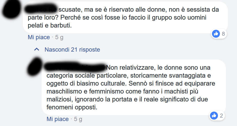 Nei gruppi le vedo iscritte, ma non scrivono e sinceramente vedendo il tenore spesso delle risposte lo capisco benissimo perché non lo fanno. Per cui ho pensato di fare un gruppo solo per donne e vedere quante persone avrebbero aderito, e soprattutto se avessero scritto.