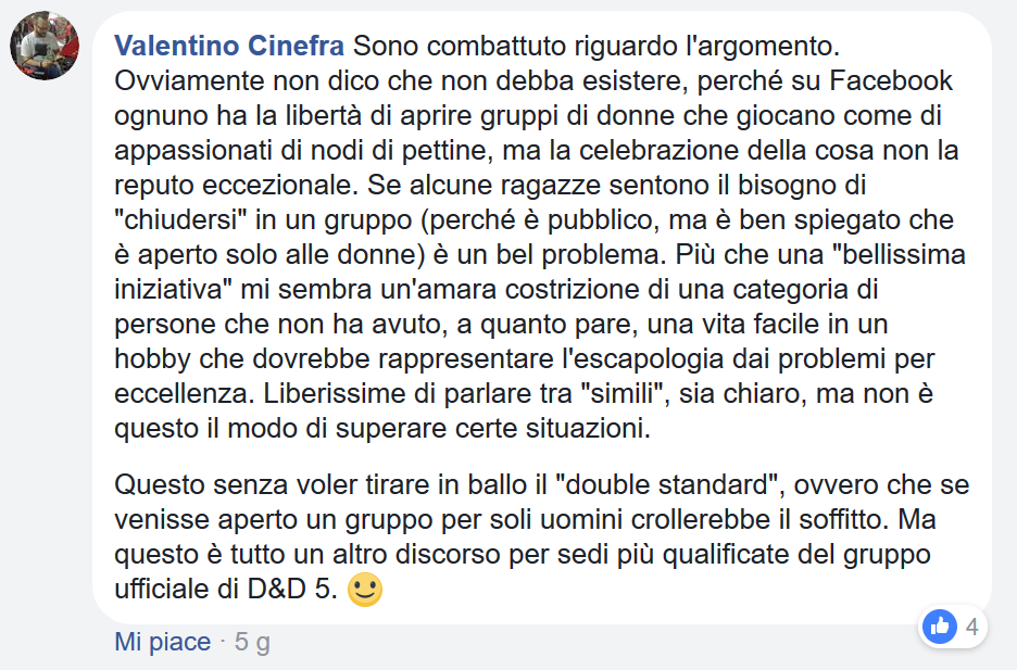 Come potete vedere nel mio commento alla vicenda, sono combattuto. Il problema non è l’esistenza di un gruppo del genere, perché se su Facebook è possibile riunirsi per discutere del fatto che la Terra è piatta una settimana dopo il lancio del razzo di Elon Musk su Marte, non vedo perché delle donne dovrebbero riunirsi e parlare di giochi di ruolo.